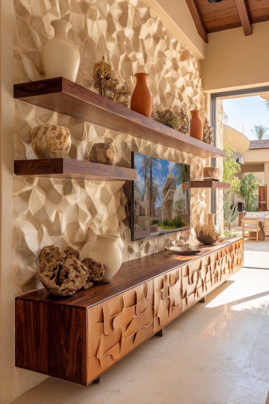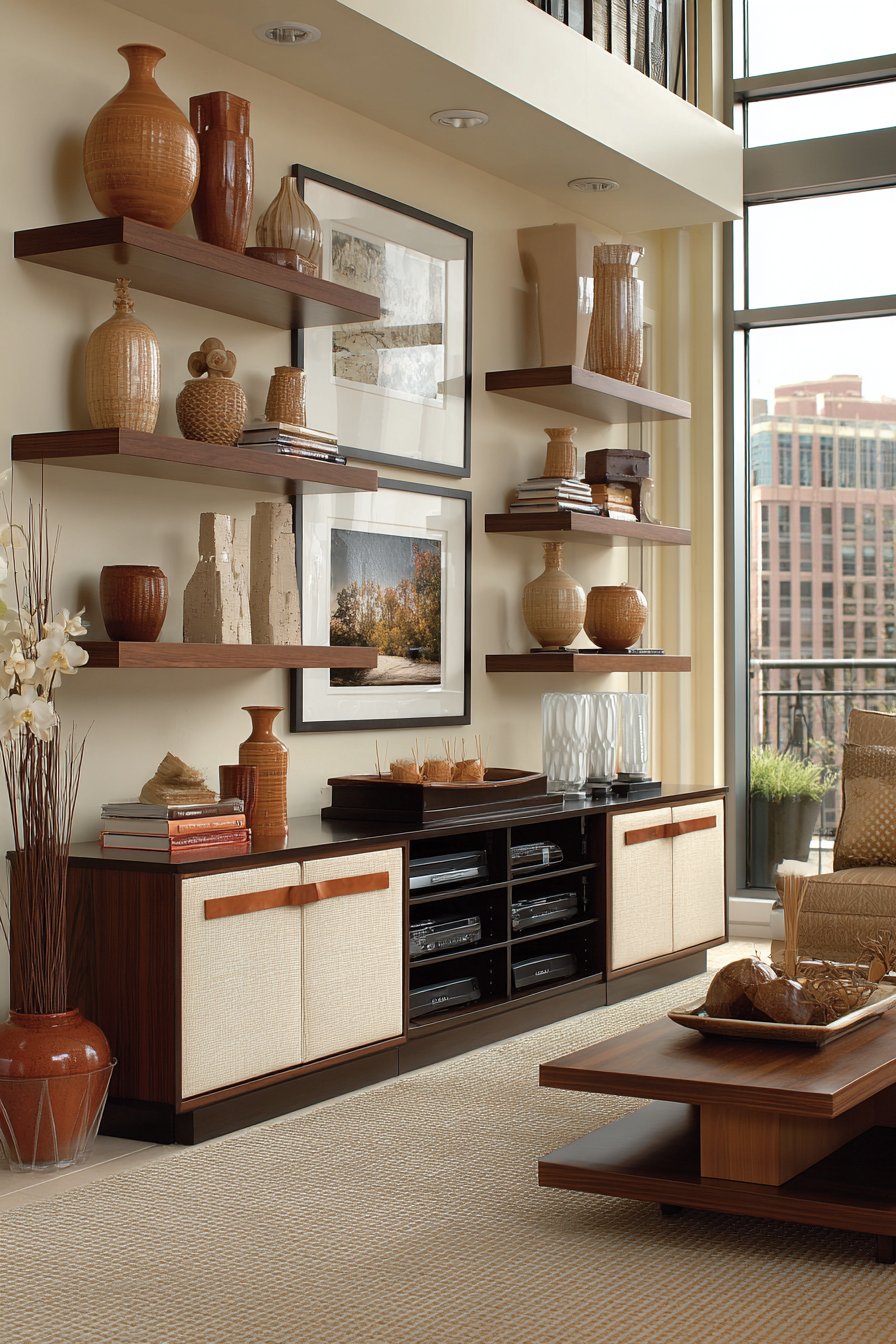 Floating shelves in the same walnut finish break up the solid cabinetry, providing display opportunities for curated decor in cream and terracotta tones. These open shelves create breathing room in the design, preventing the entertainment wall from feeling heavy or imposing. Carefully selected objects—a cream ceramic vase, terracotta bowls, art books with neutral spines, and small sculptural pieces—occupy the shelves with intentional spacing that feels curated rather than cluttered. The surrounding walls, painted in a warm beige with subtle undertones, provide a neutral backdrop that allows the rich wood tones to take center stage.