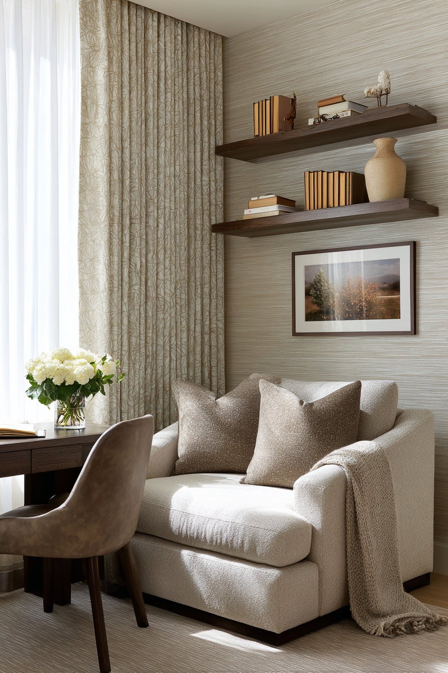 The beige upholstered task chair provides ergonomic support with style, its neutral tone ensuring it blends with the living room’s brown and beige palette rather than screaming “office chair.” The upholstery might feature performance fabric for stain resistance and easy cleaning, while the chair’s design balances comfort and aesthetic appeal. Above the desk, floating shelves in light oak provide storage for office supplies, reference books, and decorative objects. The shelving’s open design prevents the workspace from feeling enclosed while its light wood tone creates subtle contrast with the darker desk.