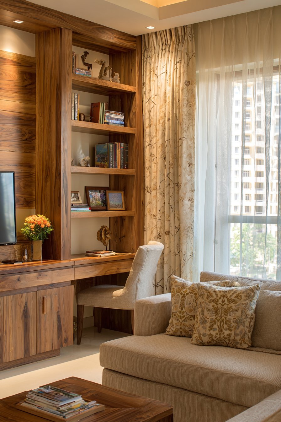 Key Design Tips: Choose compact desks in walnut or brown wood tones that provide adequate workspace without overwhelming living areas. Select task chairs in beige upholstery to blend with the living room palette while providing ergonomic support. Install floating shelves in light oak above workspace for storage that doesn’t visually enclose the area. Coordinate desk accessories in brown leather, beige ceramic, and brass to maintain the color story. Position workspace near windows to maximize natural light for both task illumination and mood enhancement. Use desk lamps with beige shades or brass bases to provide task lighting while reinforcing the aesthetic. Keep the desk surface edited and organized to prevent workspace clutter from disrupting living area calm. Choose a desk with drawers or add desktop organizers to contain office supplies out of sight. Consider a desk with cable management features to hide technology wires. Position workspace in a corner or against a wall to define its zone while keeping main living areas open and flowing.
