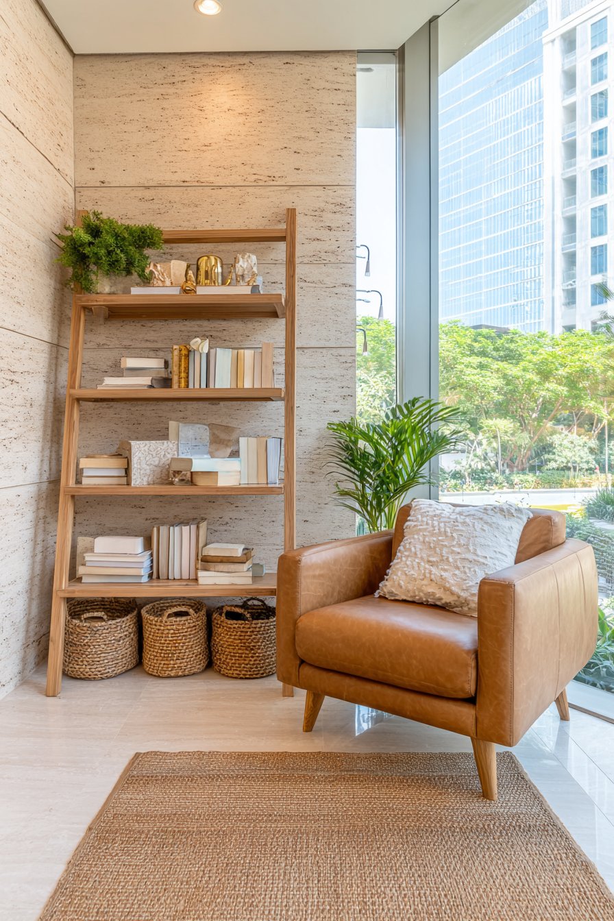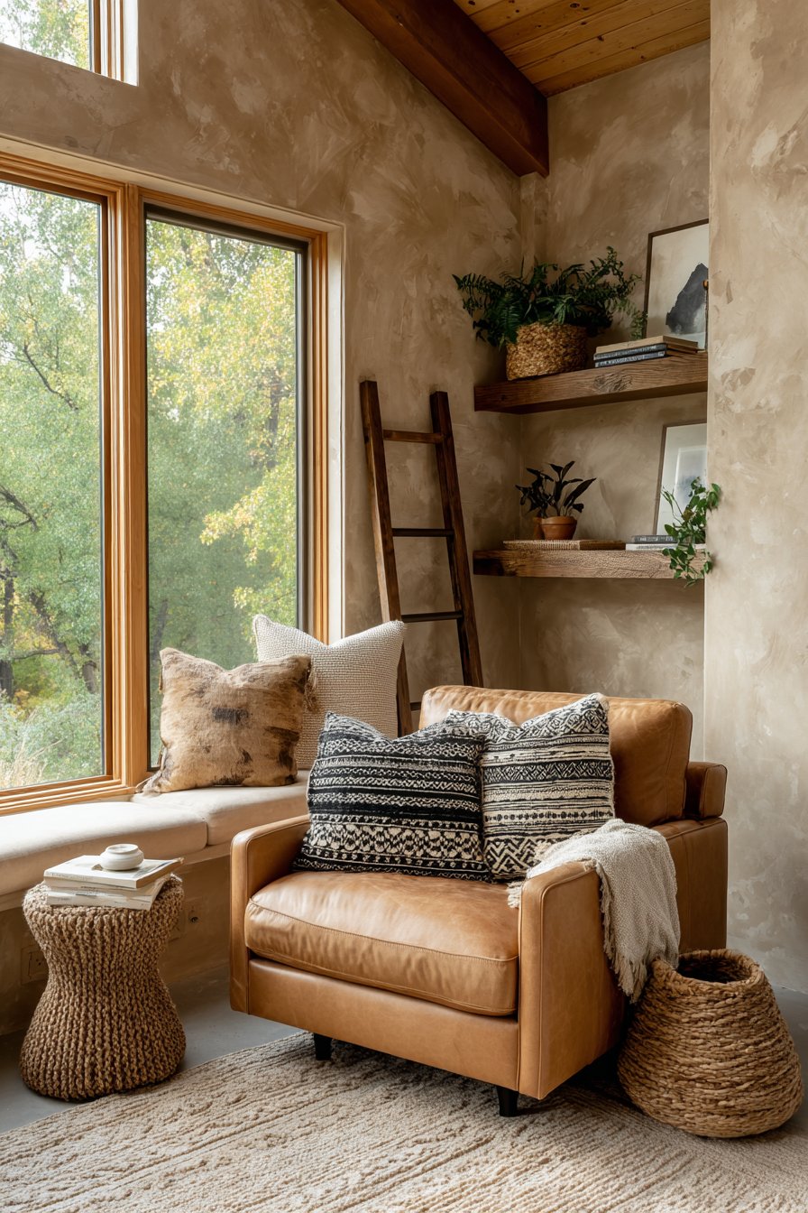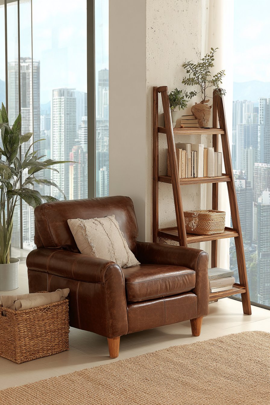 5. Cozy Reading Retreat with Camel Leather and Natural Light