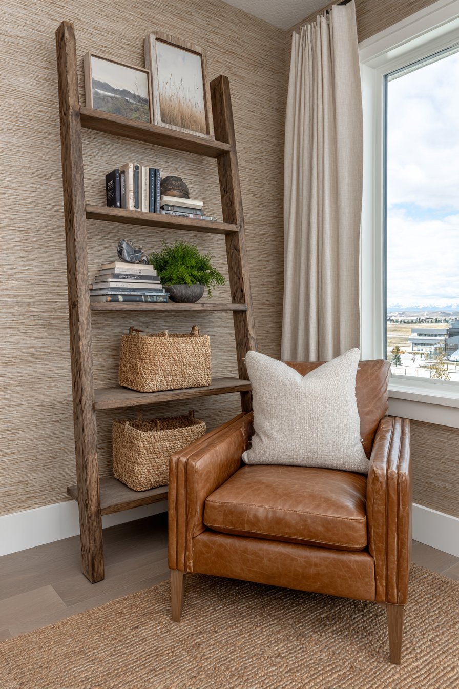 Key Design Tips: Position reading chairs near windows to maximize natural light for comfortable daytime reading. Choose camel or tan leather for armchairs to add warmth and luxury while maintaining the brown and beige palette. Install textured wall treatments in beige tones to add visual interest and define the reading zone. Use ladder shelving in medium brown wood tones for space-efficient storage with architectural interest. Incorporate jute rugs to define intimate zones within larger spaces while adding natural texture. Fill woven baskets with reading accessories for organized, accessible storage that maintains the aesthetic. Select chairs with high backs and deep seating for comfortable extended reading sessions.