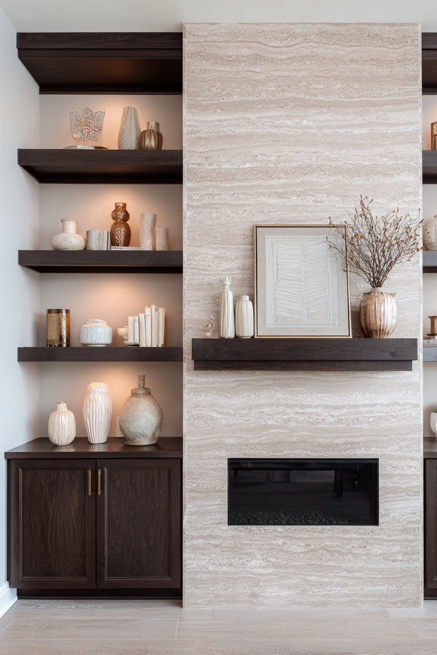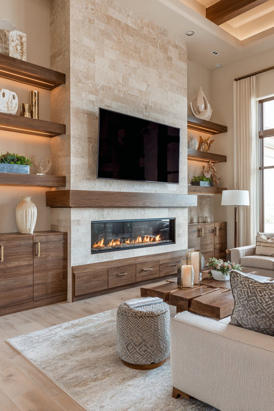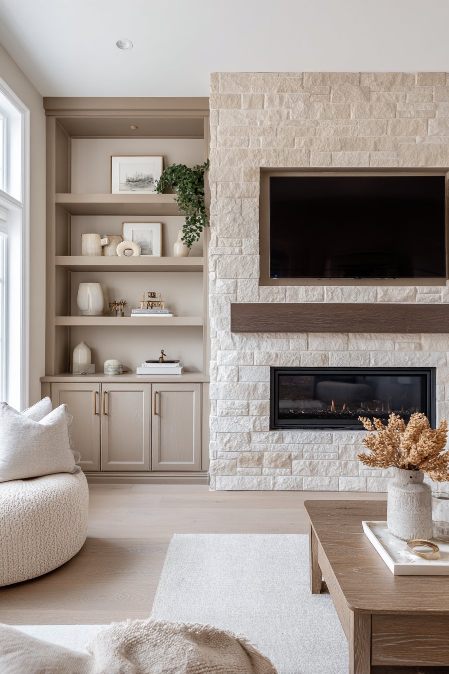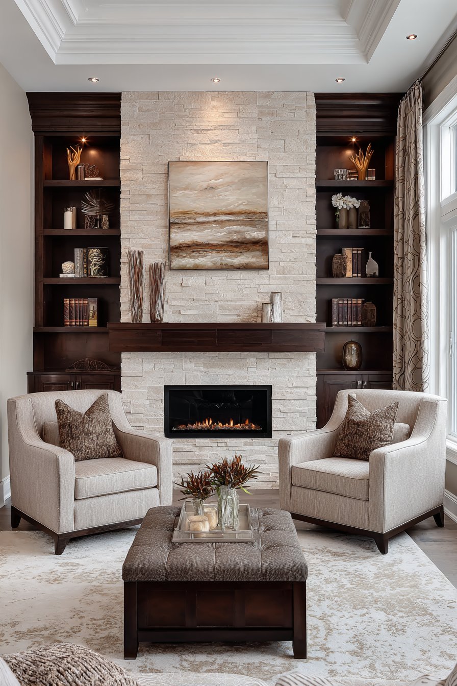 Key Design Tips: Select natural stone in beige and tan tones to create a focal fireplace wall with organic texture and warmth. Choose a dark brown wooden mantel for contrast and practical display space. Keep mantel styling minimal with carefully selected objects in cream and bronze tones. Install flanking built-in cabinets in matching wood tones to create symmetry and provide storage. Use recessed or integrated lighting to highlight stone texture and create dramatic evening ambiance. Ensure stone selection shows natural color variation for dimensional interest. Consider the room’s scale when determining mantel thickness and stone installation height. Position seating to take advantage of the fireplace focal point while maintaining conversation-friendly arrangement.