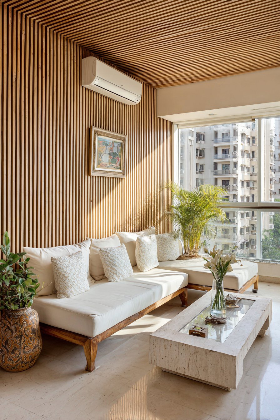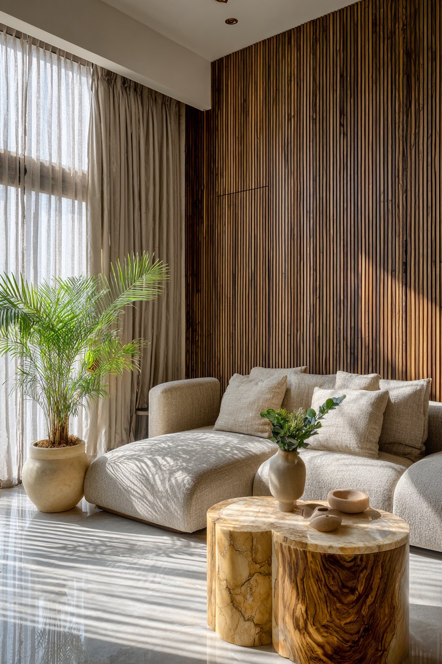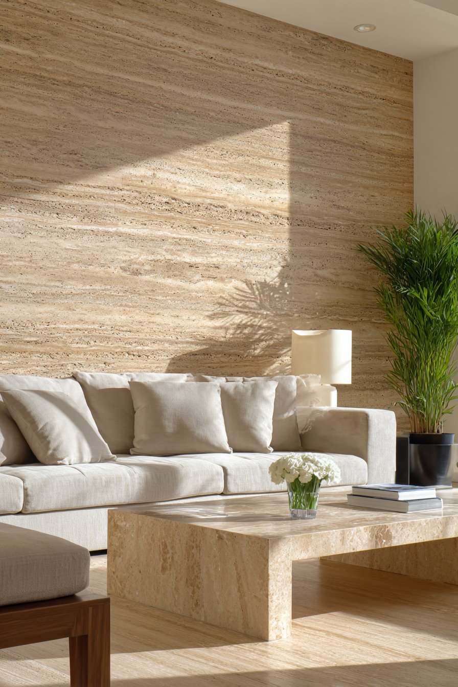 A travertine coffee table introduces organic texture and natural stone beauty to the center of the arrangement. Travertine’s porous surface, filled voids, and subtle color variations from cream to light tan create visual interest while its substantial weight and cool surface provide practical functionality. The stone’s earthy quality connects perfectly with the wood slat wall and beige upholstery, reinforcing the natural material story. As natural light enters from adjacent windows, it creates linear shadow patterns across the slats—an ever-changing display that serves as living artwork.