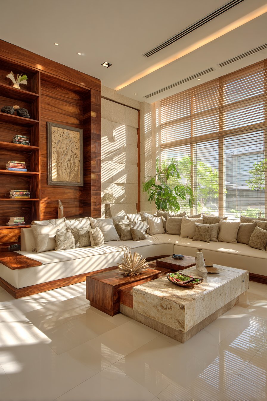 Key Design Tips: Install horizontal wood slats in walnut or medium brown tones to create an architectural feature wall with dimensional interest. Space slats consistently to create rhythm and allow for shadow play as light moves throughout the day. Choose beige modular seating to maintain focus on the feature wall while providing comfortable, flexible seating. Incorporate travertine or other natural stone for coffee tables to add organic texture and cool contrast. Position the feature wall opposite primary seating for maximum visual impact. Use LED strip lighting behind slats for dramatic evening effect and to emphasize the three-dimensional quality. Ensure proper installation with wall anchors capable of supporting the slat weight. Consider acoustic benefits of the slat wall in reducing echo in large, hard-surfaced rooms.