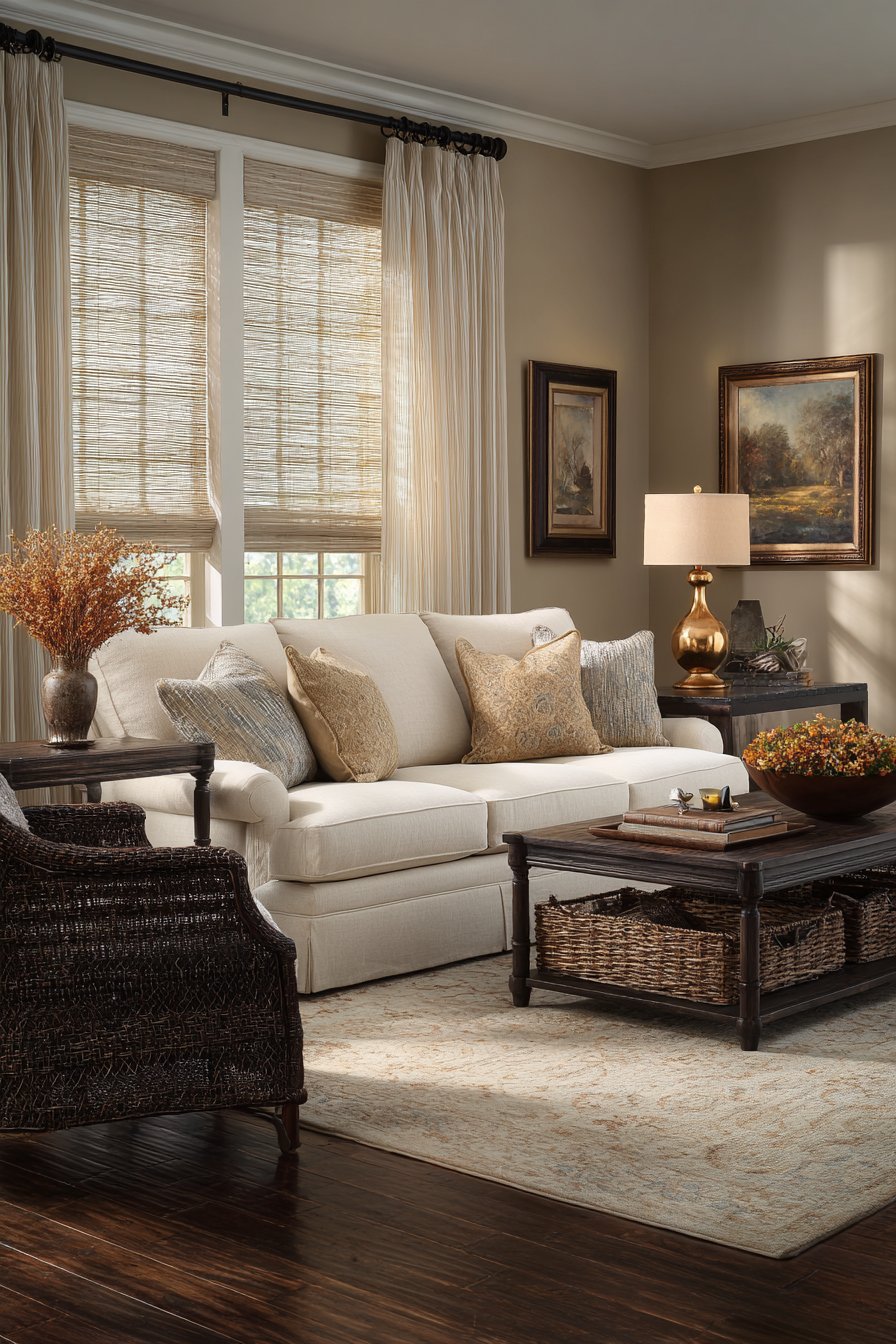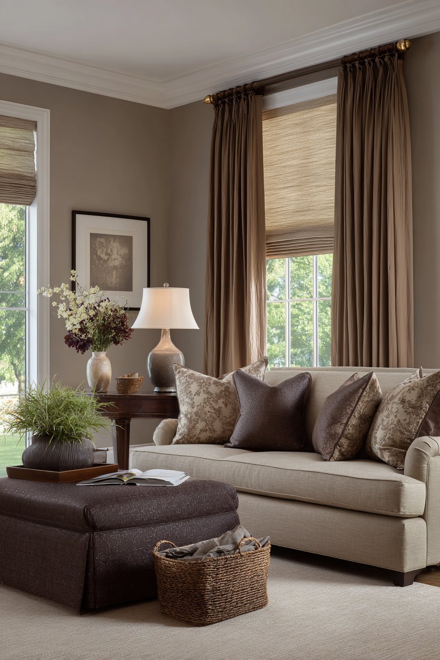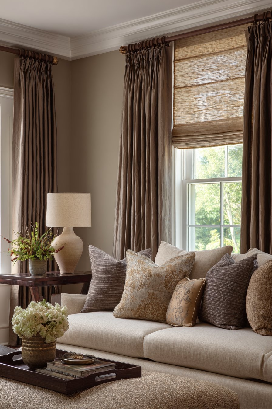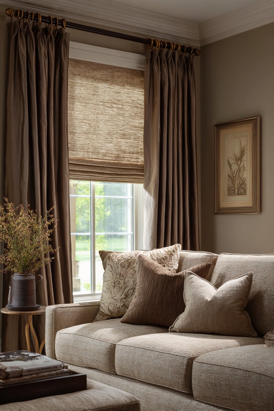 Key Design Tips: Layer Roman shades in natural linen beige with curtain panels in warm taupe for maximum flexibility in light and privacy control. Mount curtain rods several inches above window frames and extend beyond frame width to create the illusion of larger windows. Choose dark brown wooden rods with brass finials to complement the brown and beige palette while adding traditional elegance. Select natural linen for shades to filter light softly while maintaining a natural, organic aesthetic. Ensure curtain panels reach the floor for visual height and proper proportion. Use panels in a slightly heavier weight for beautiful draping and improved insulation. Consider motorization for Roman shades to enhance convenience while protecting the delicate fabric from handling. Install on a layered track system or dual rods to allow independent operation of shades and panels.