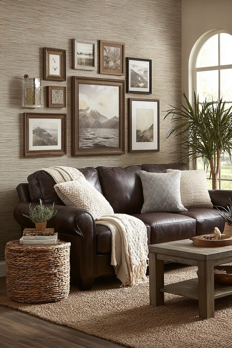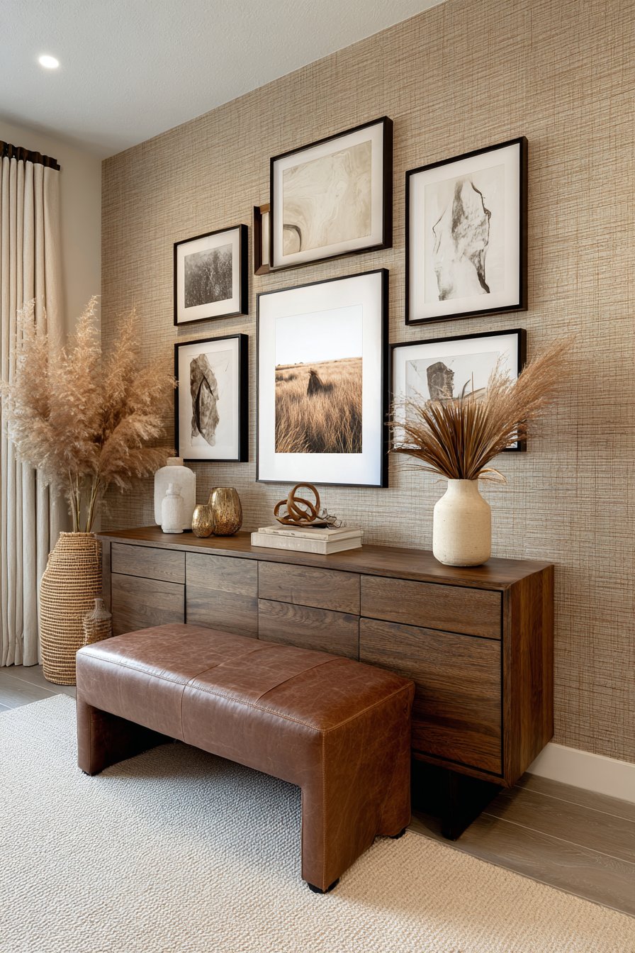 Key Design Tips: Mix frame woods in varying brown tones from light to dark to create cohesive variety in gallery wall presentations. Choose grasscloth wallpaper in beige tones to add subtle texture and warm backdrop for artwork. Curate artwork in neutral tones—sepia photography, beige abstracts, and cream-toned pieces—to maintain the color palette. Arrange frames following a loose grid with slight spacing variations for organic feel. Include varied sizes and orientations (vertical and horizontal) to create visual interest. Position a leather console below the gallery wall to ground the display and provide functional surface. Maintain consistent mat colors in cream or beige to unify diverse artwork. Use picture hanging systems that allow for easy adjustment and future changes without new wall holes.
