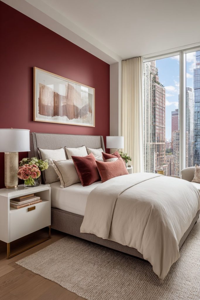 Creating a focal point wall in cherry red serves as the foundation for a bold bedroom transformation. This approach allows you to embrace the trend without overwhelming the entire space. A single cherry red wall behind your headboard instantly draws the eye and creates visual drama that anchors the room’s design scheme.