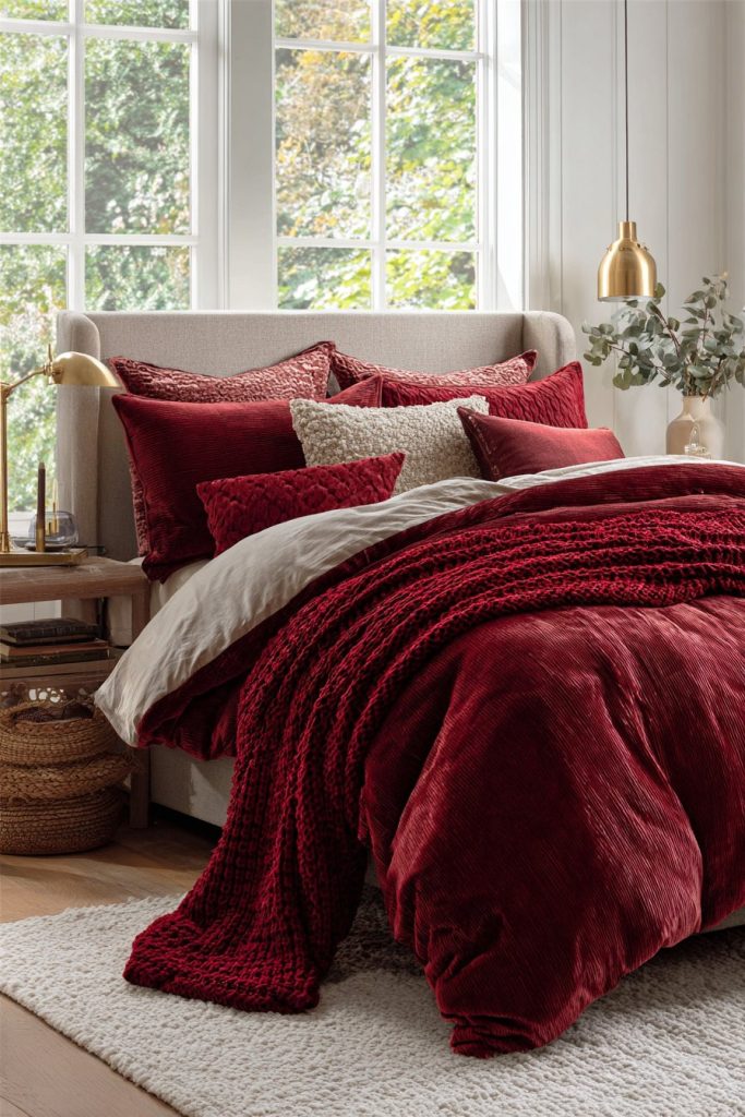 2. Luxurious Cherry Red Bedding and Textiles
