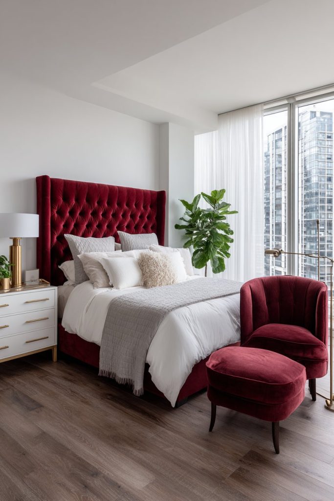 A statement furniture piece in cherry red serves as both functional necessity and artistic centerpiece. Consider a tufted cherry red headboard, an elegant armchair, or a sleek dresser in this bold hue. These substantial pieces demonstrate design commitment while providing practical bedroom functionality.
