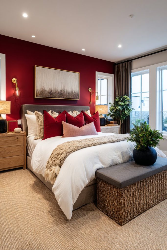 Natural materials provide essential grounding for cherry red bedrooms. Incorporate warm wood tones, woven textures, and organic elements to prevent the space from feeling overly dramatic. Plants add living color that complements red beautifully while improving air quality and creating calming energy within your bold design scheme.