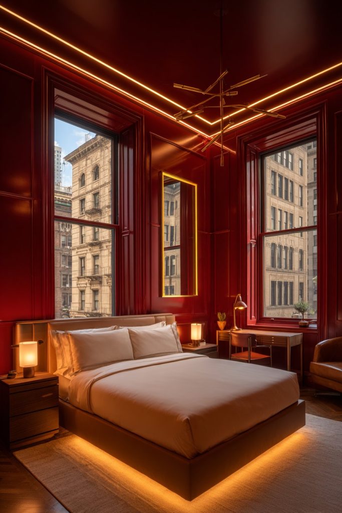 Proper lighting design makes or breaks a cherry red bedroom. Natural light interacts dramatically with red, appearing warmer during golden hour and more intense at midday. Install adjustable window treatments that allow light control throughout the day, preventing the space from feeling too intense during bright afternoons.