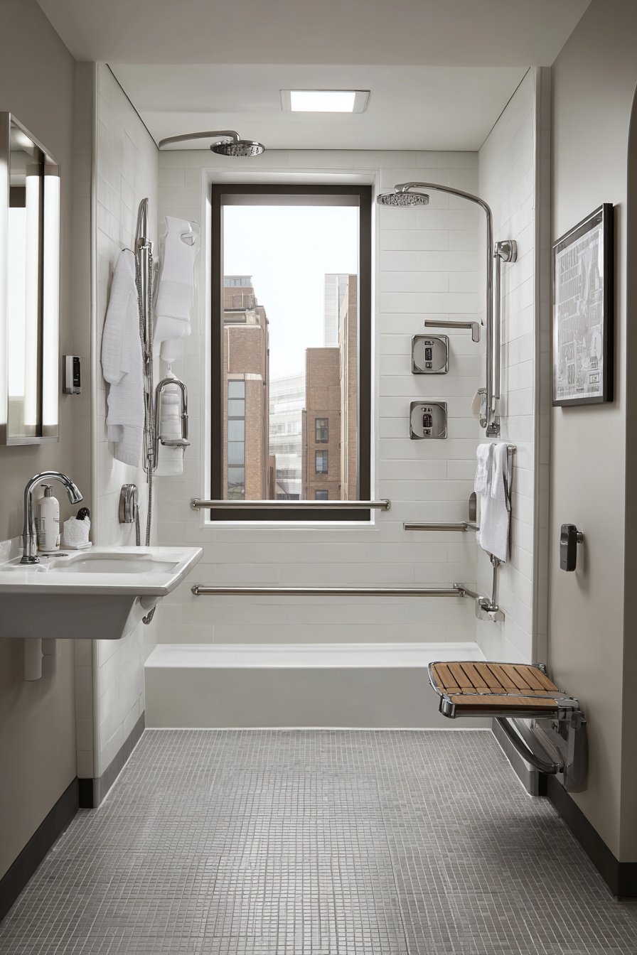 - Position shower controls at accessible heights (38-48 inches typically)