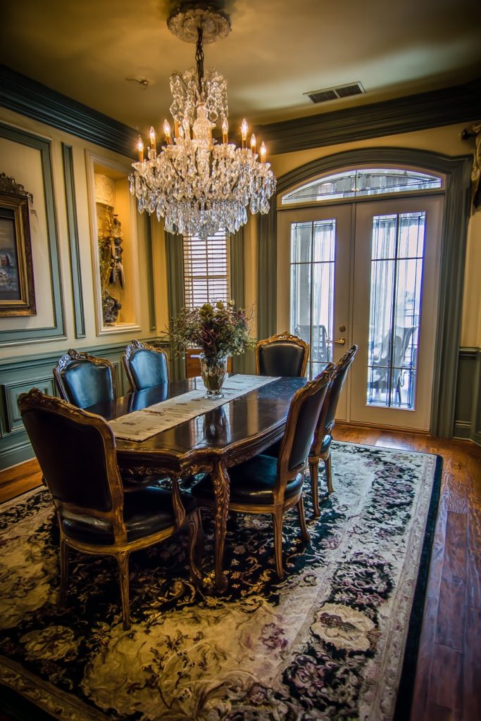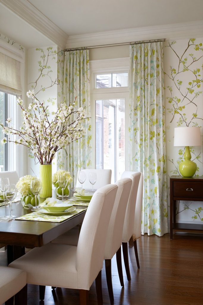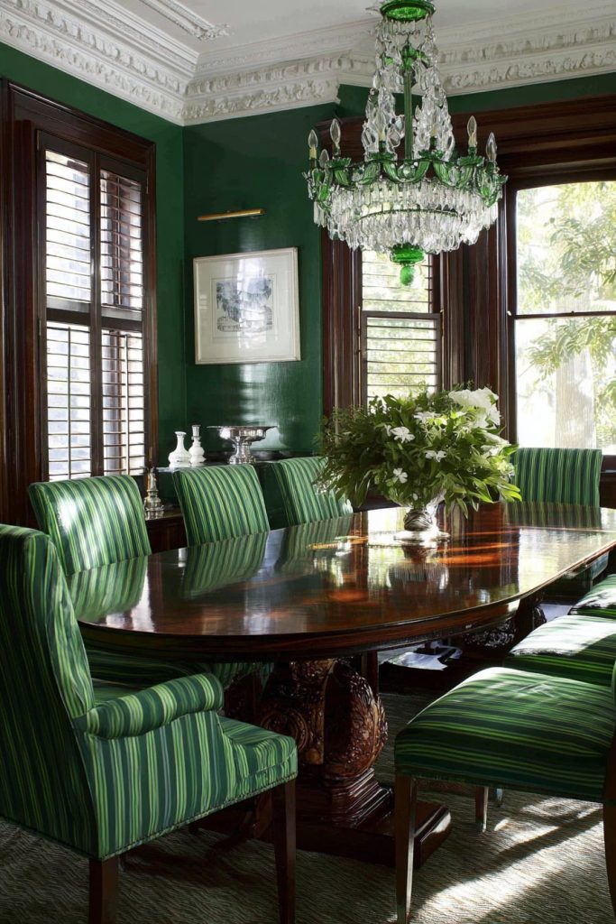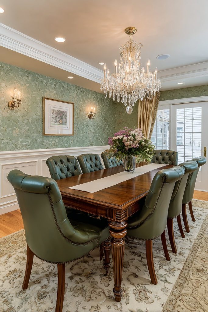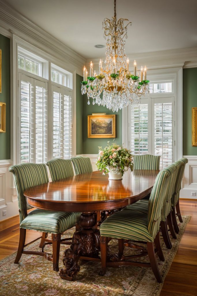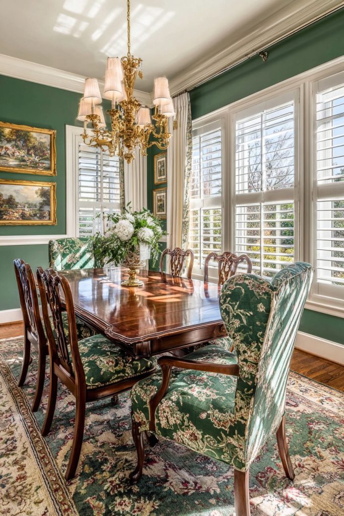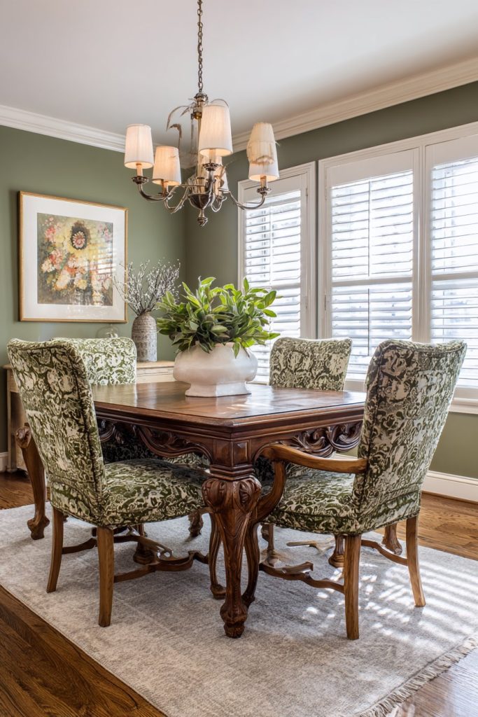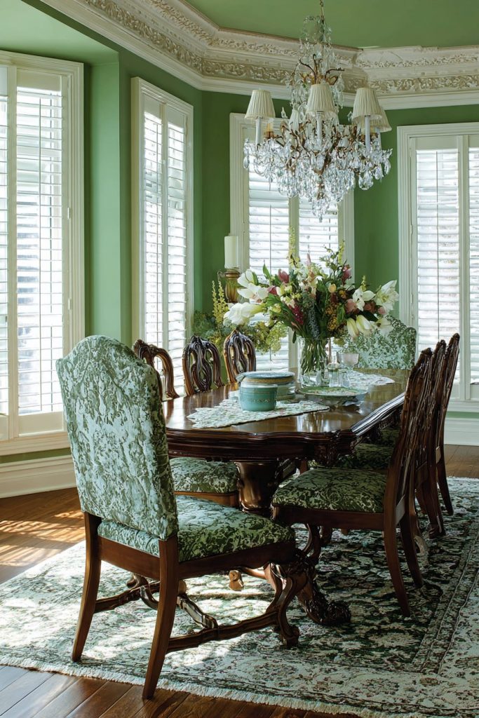 Queen Anne-style chairs with green damask upholstery represent the height of traditional dining room elegance. The curved lines and cabriole legs of Queen Anne furniture add grace and movement to the space while damask fabric patterns introduce subtle texture and visual interest. The repetition of green in both walls and upholstery creates color continuity while different shades and textures prevent monotony.