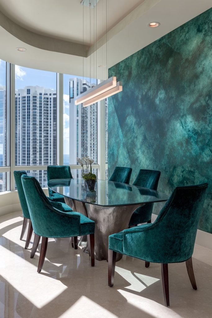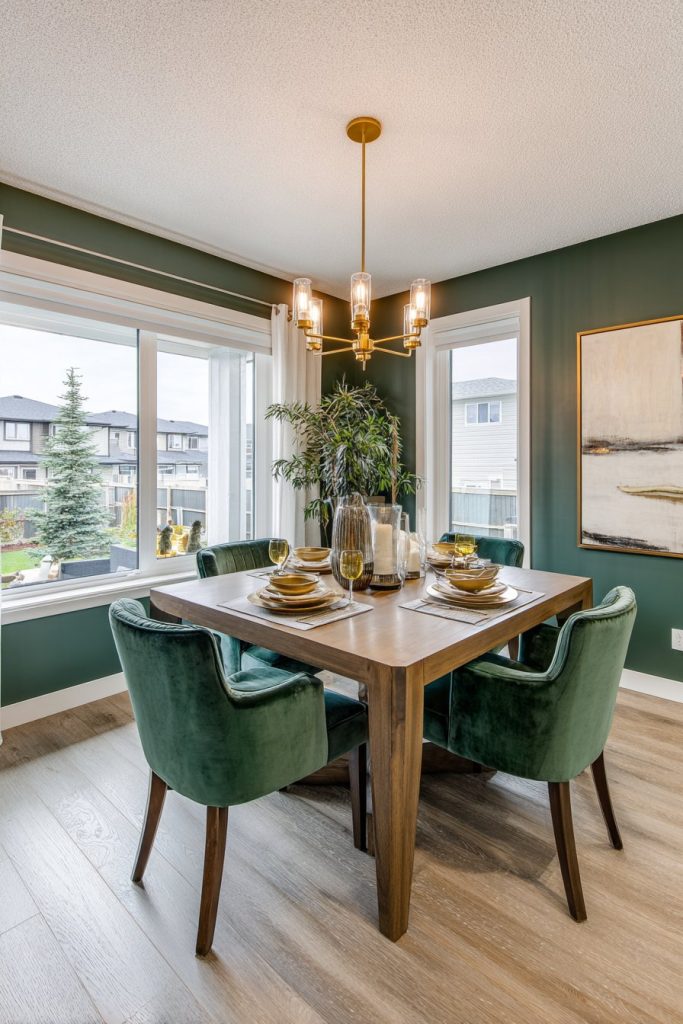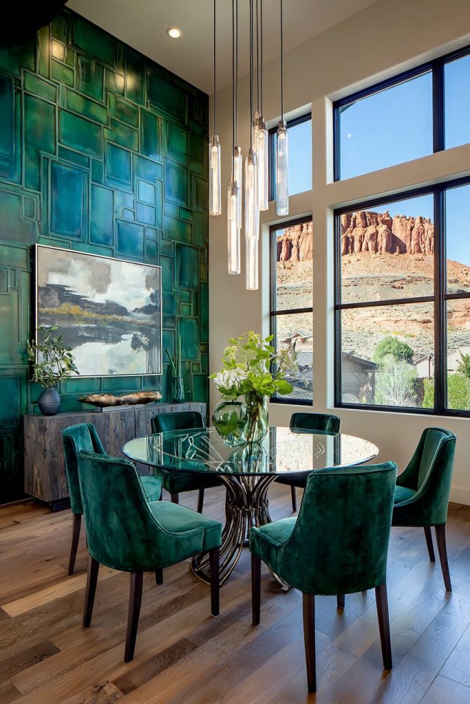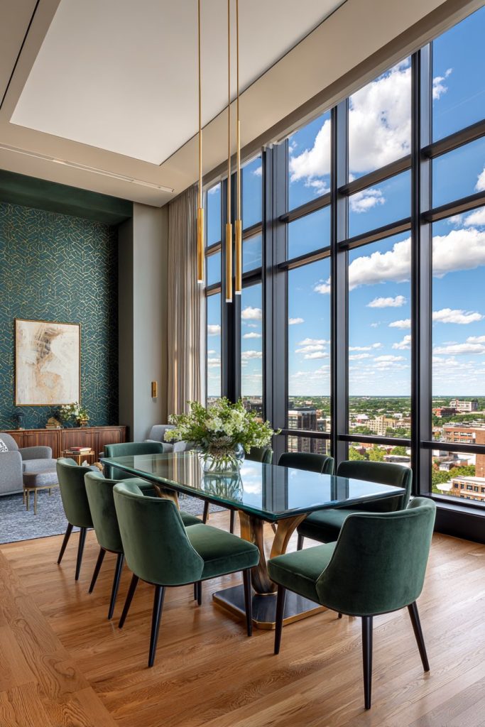 High-back dining chairs upholstered in matching emerald velvet with nailhead trim create a cohesive seating arrangement that feels like custom-designed luxury furniture. The repetition of velvet in both walls and seating creates textural continuity while nailhead trim adds metallic accents that catch and reflect light. High backs provide comfort and create a sense of enclosure that enhances intimate dining experiences.