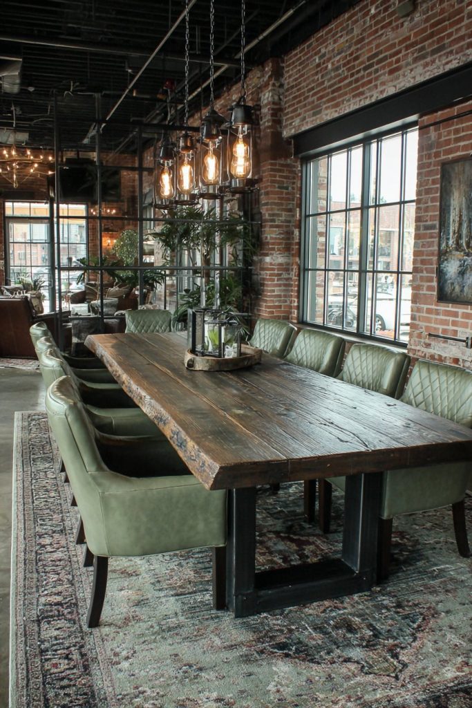 Metal dining chairs with green leather seats provide comfortable seating that maintains the industrial aesthetic while introducing color and softness. The patina that develops on metal over time adds character while leather upholstery improves with age and use. This combination of materials creates furniture that becomes more beautiful and comfortable over time rather than showing wear as deterioration.