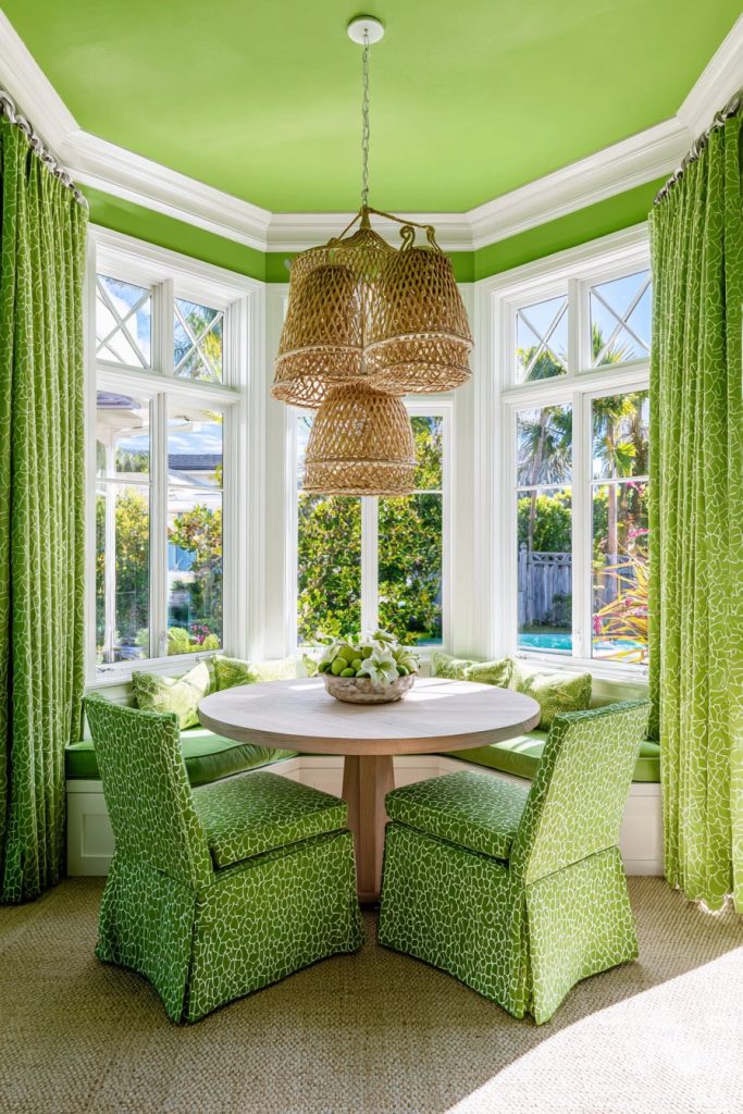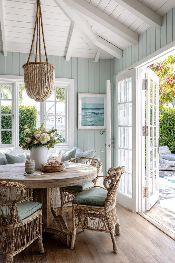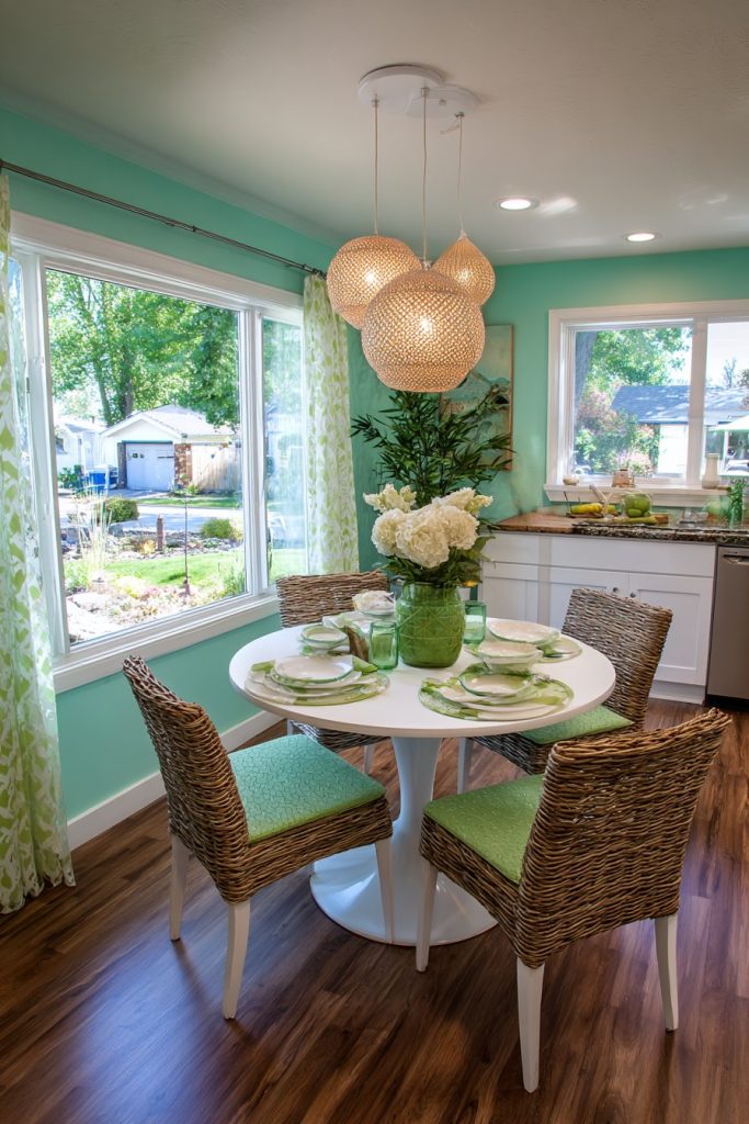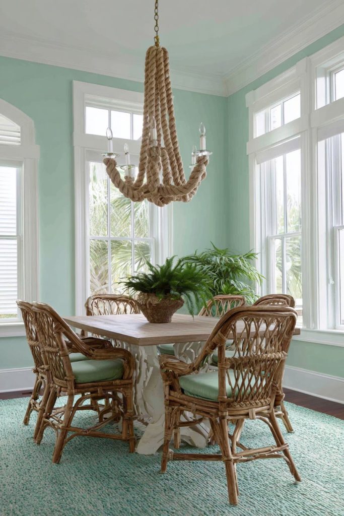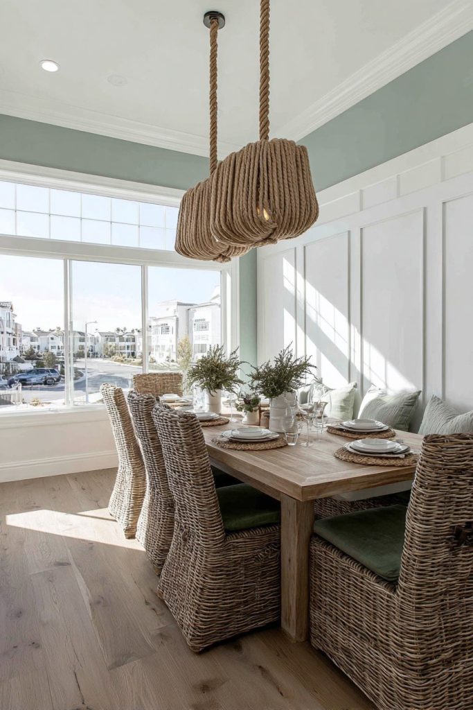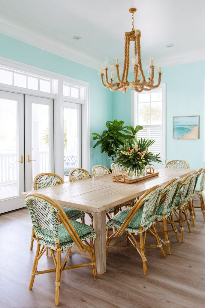 Rattan dining chairs with green cushions provide comfortable seating that reinforces the coastal theme while adding natural texture and casual comfort. Rattan’s organic curves and woven texture create visual interest while remaining lightweight and practical for everyday use. The green cushions tie the seating to the wall color while providing comfort and seasonal flexibility.