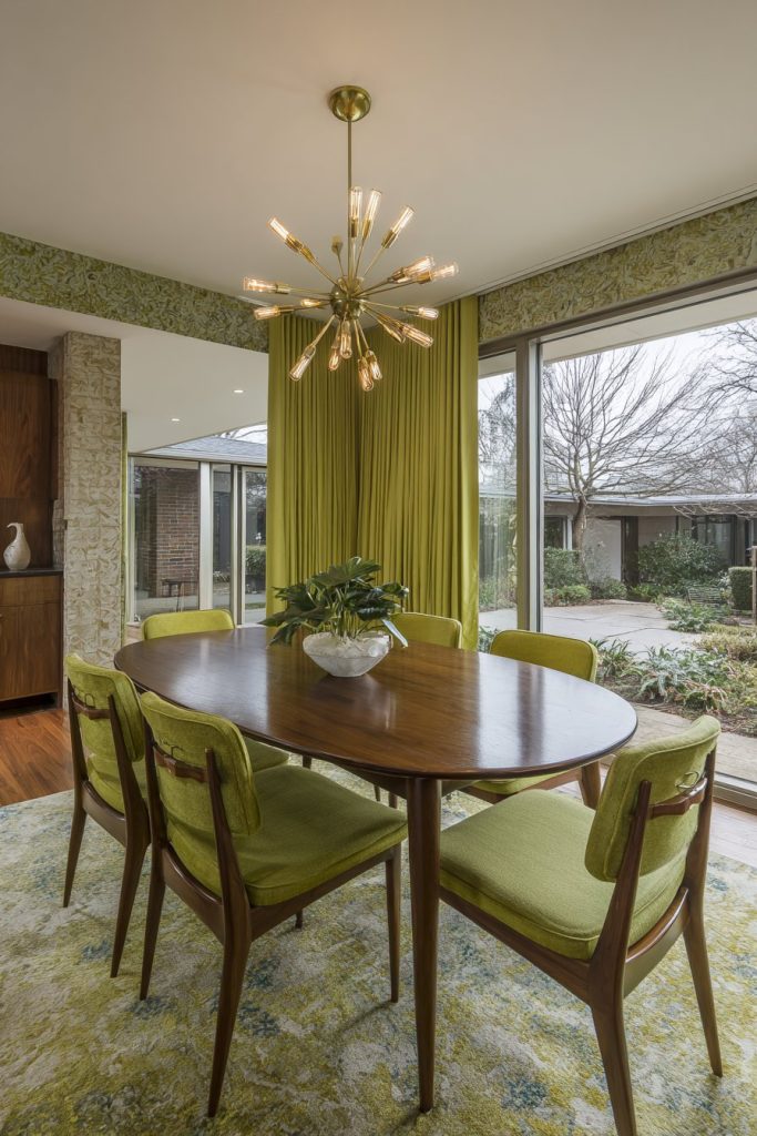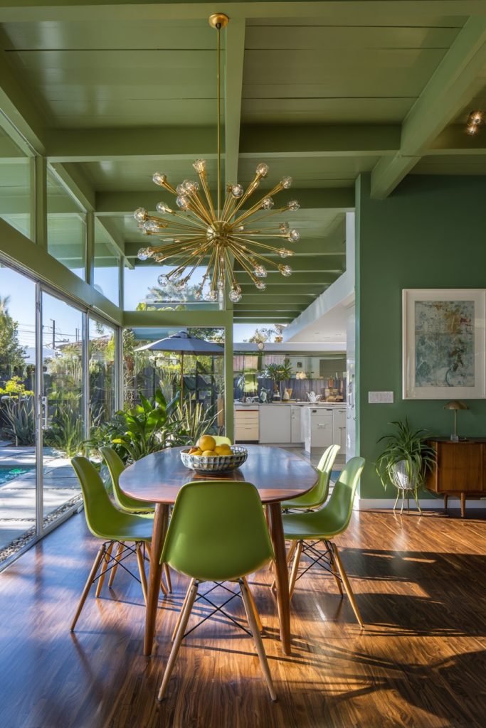 Muted chartreuse green walls create the perfect backdrop for authentic mid-century modern furniture while maintaining the era’s commitment to bold color choices. This yellow-green tone captures the optimism and innovation of the 1950s and 60s while remaining sophisticated enough for contemporary living. Chartreuse’s unique position between yellow and green makes it particularly effective at enhancing the rich tones in walnut furniture.