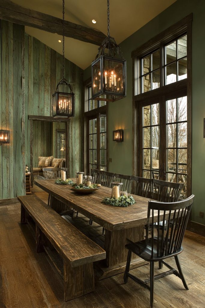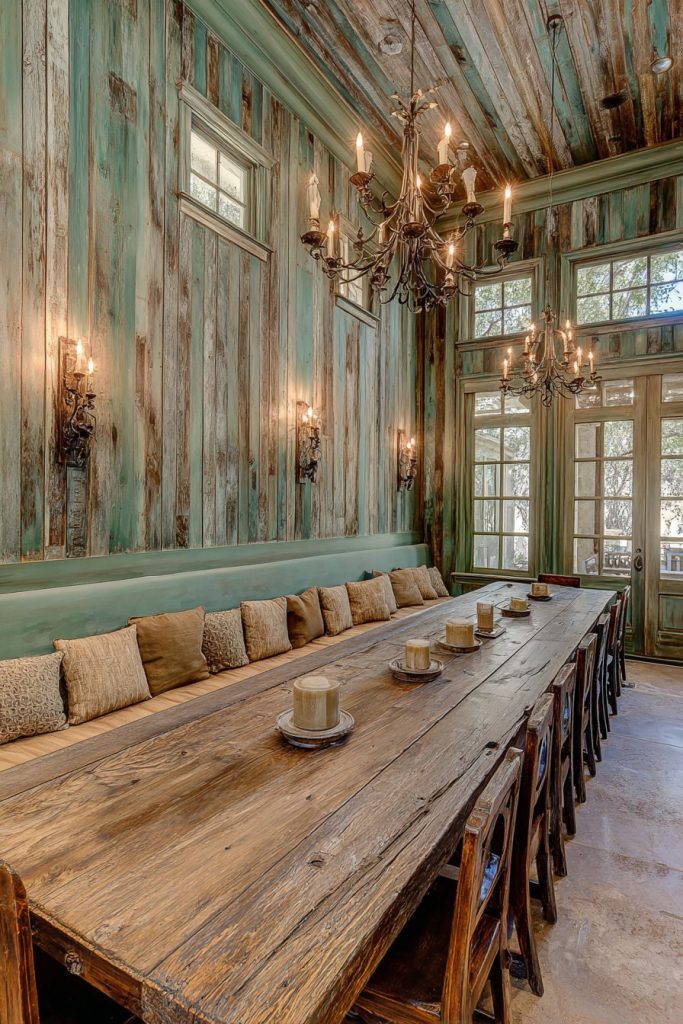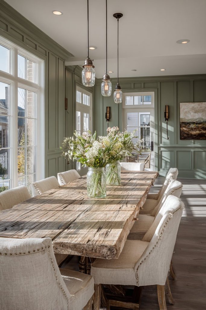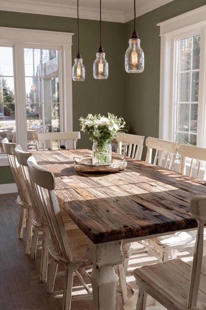Reclaimed wood dining tables bring genuine character and history to farmhouse-style spaces. Each piece tells a story through its weathered surface, nail holes, and natural edge grain that machine-made furniture simply cannot replicate. The contrast between the smooth olive green walls and the textured, weathered wood creates visual tension that keeps the eye engaged and interested.