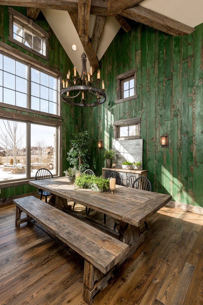 Reclaimed barn wood walls stained in sage green preserve the natural grain patterns while updating the color for contemporary living. This approach maintains the authentic texture and character of weathered wood while creating a cohesive color story that feels both rustic and refined. The visible grain patterns add visual interest and texture that prevents solid-colored walls from appearing flat or artificial.