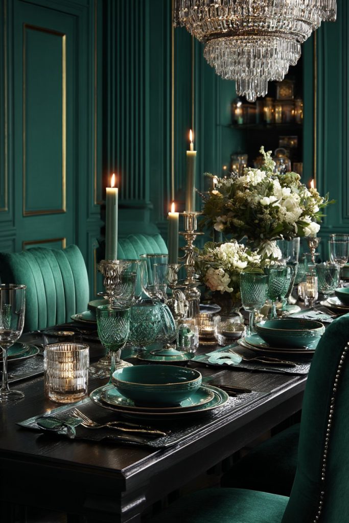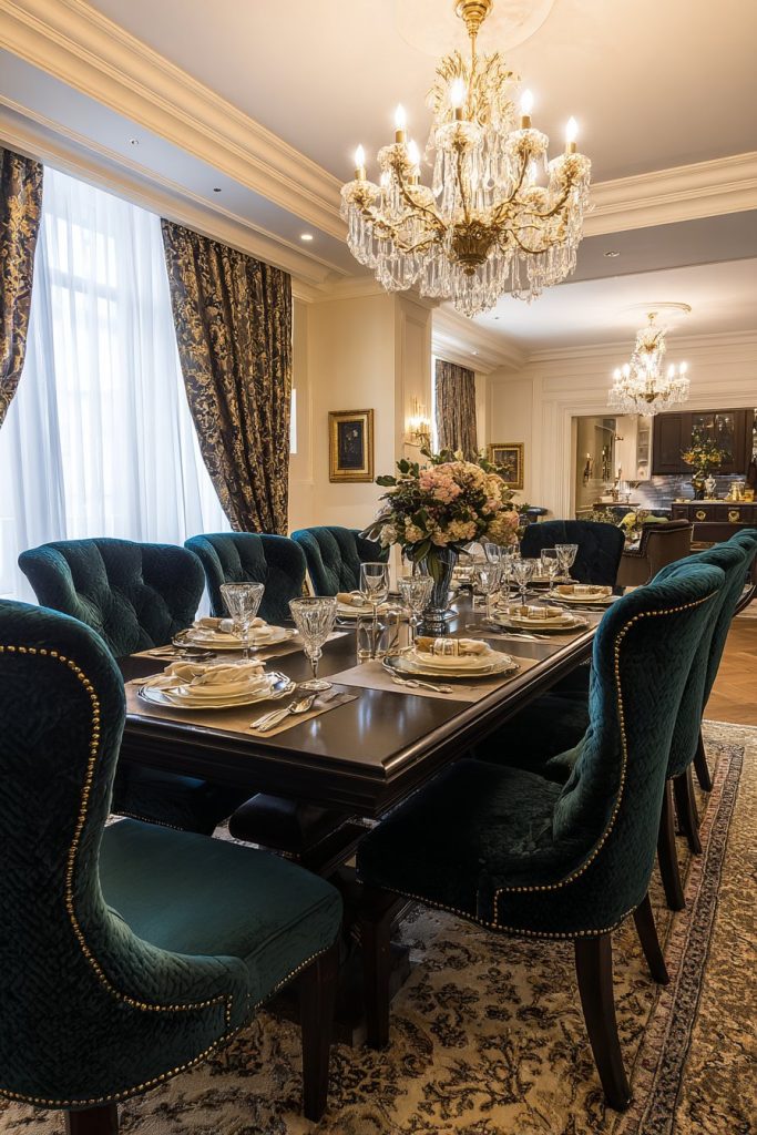Polished ebony dining tables provide the perfect contrast to emerald green while maintaining the luxurious material palette. Ebony’s deep black color and mirror-like finish create sophisticated drama while reflecting light and color from surrounding surfaces. The substantial weight and premium cost of ebony furniture makes it a true investment piece that adds lasting value and prestige to formal dining rooms.