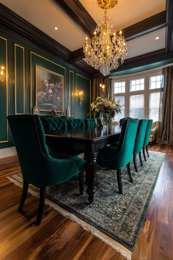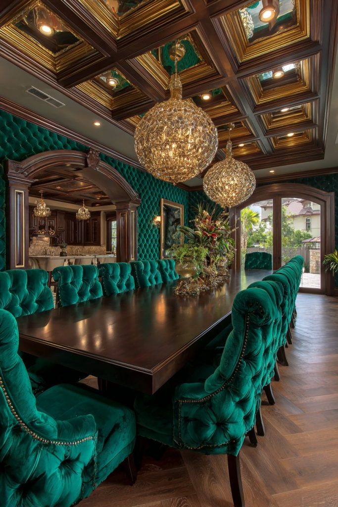 Rich emerald green velvet wall panels with gold trim details create the ultimate expression of dining room luxury and sophistication. This approach to wall treatment transforms ordinary drywall into custom upholstery that adds both visual drama and acoustic softness. The tactile quality of velvet invites touch while the deep emerald color creates richness that changes throughout the day as lighting conditions shift.