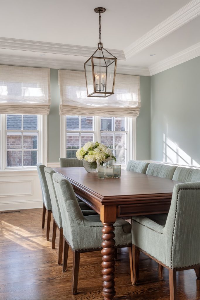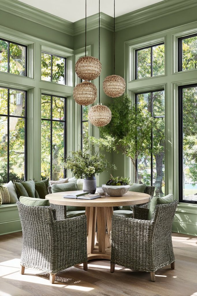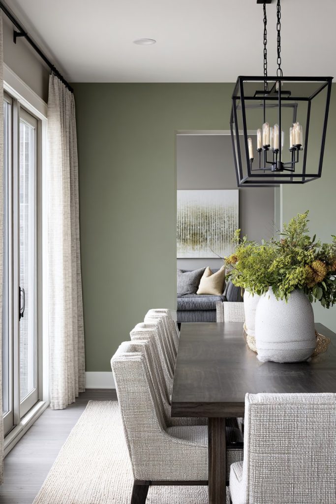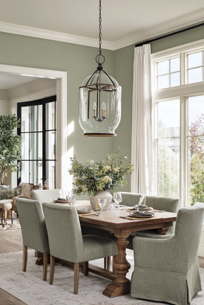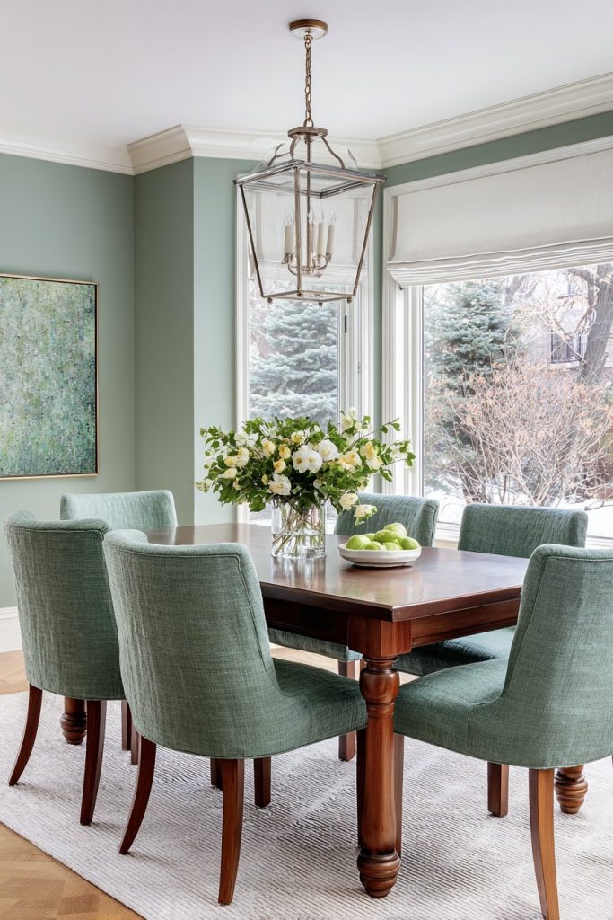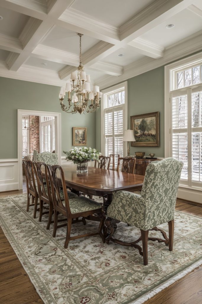 Sage green walls with decorative white molding create the perfect backdrop for traditional dining room elegance. This classic color combination has been used in fine homes for centuries because it creates sophistication without overwhelming the space or competing with furniture and artwork. The contrast between sage green and crisp white trim adds architectural definition that enhances the room’s proportions and character.