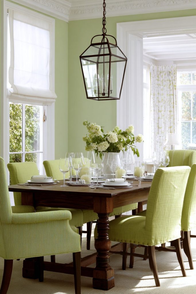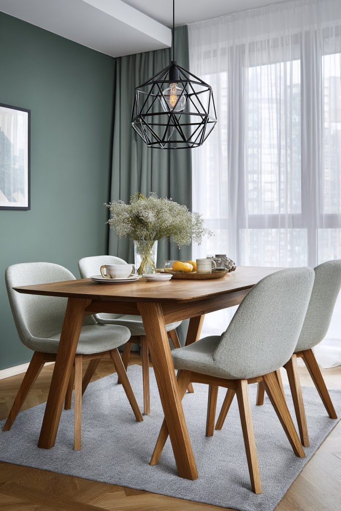 Mint green walls in smaller dining spaces create an illusion of expanded space while maintaining color impact. This fresh, light green tone reflects natural light beautifully, making compact rooms feel brighter and more open than neutral colors might achieve. The psychological effect of mint green also promotes relaxation and appetite stimulation, making it ideal for intimate dining experiences.