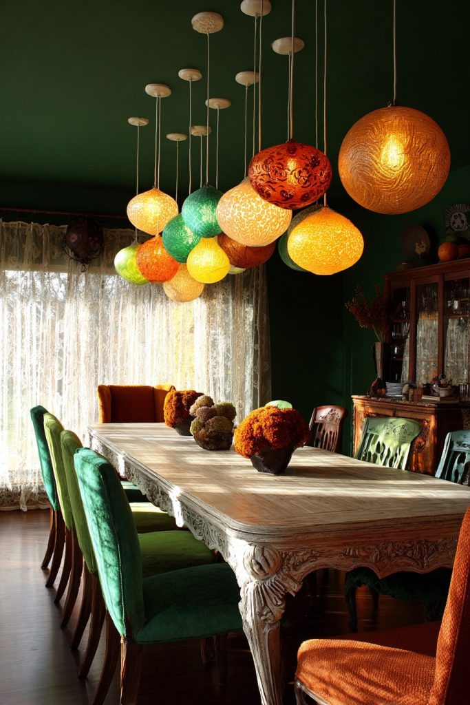 Mixed dining chairs including green velvet wingbacks and painted wooden chairs create the visual variety that makes eclectic spaces so engaging and personal. This approach requires confidence in color and proportion relationships but allows for the expression of individual taste and the incorporation of meaningful pieces collected over time. The variety prevents the space from feeling too formal or prescribed while maintaining color relationships that create coherence.