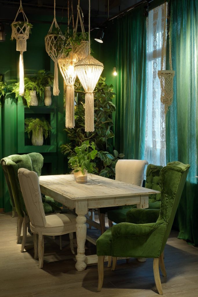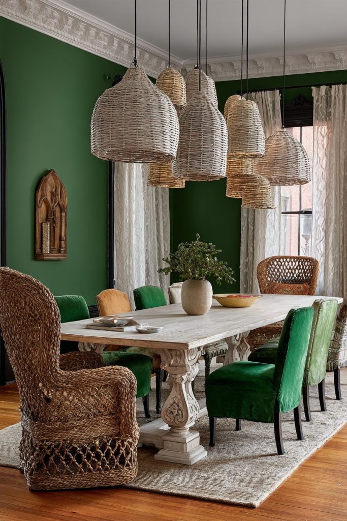 Mismatched dining chairs in various shades of green create the curated chaos that makes bohemian spaces so visually engaging. This approach requires a confident eye for color and proportion, but when successful, creates spaces that feel personal and unique. The variety of green tones adds depth to the color scheme while the different chair styles reflect the bohemian appreciation for individuality over conformity.