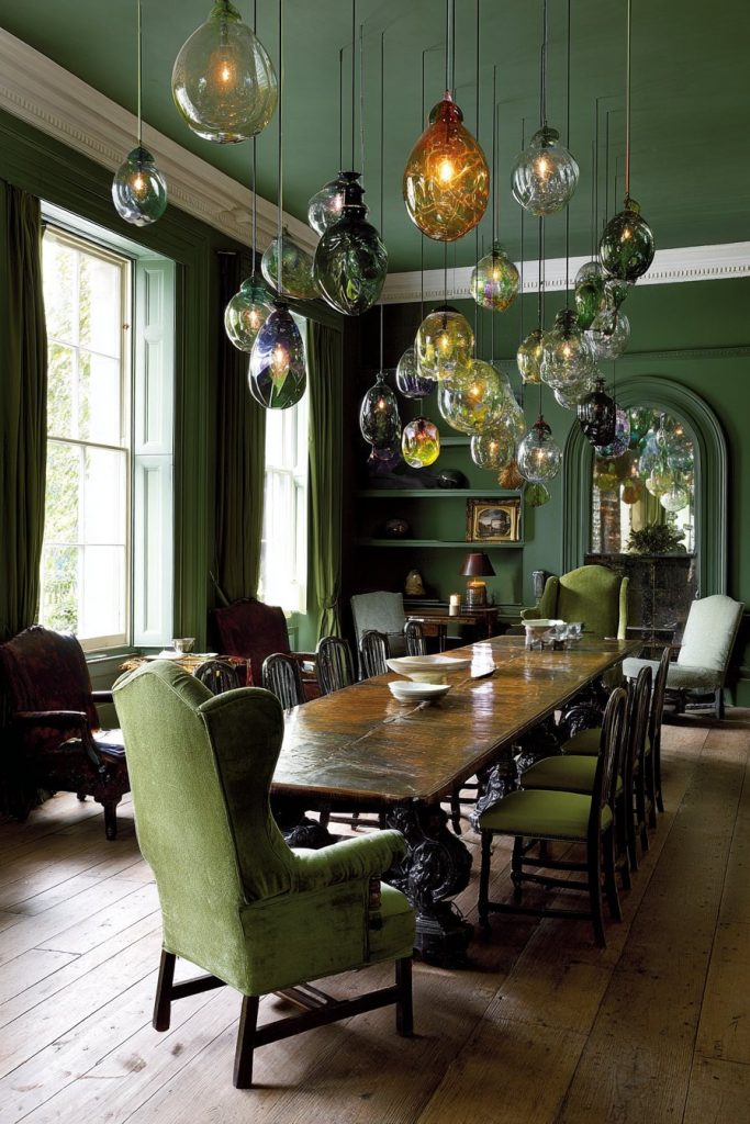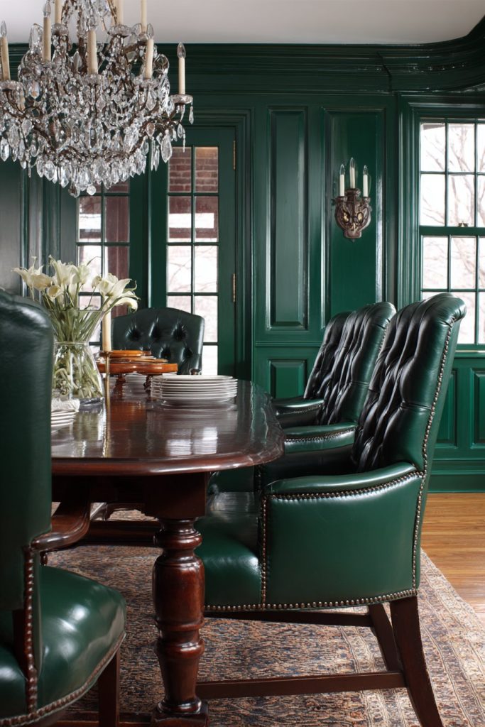 Deep green leather upholstery on dining chairs creates a monochromatic green scheme that feels intentional and sophisticated rather than accidental. Leather’s durability makes it practical for dining room use while its rich patina develops character over time. The slight variations in leather grain and color add subtle texture that prevents the monochromatic scheme from appearing flat or uninteresting.