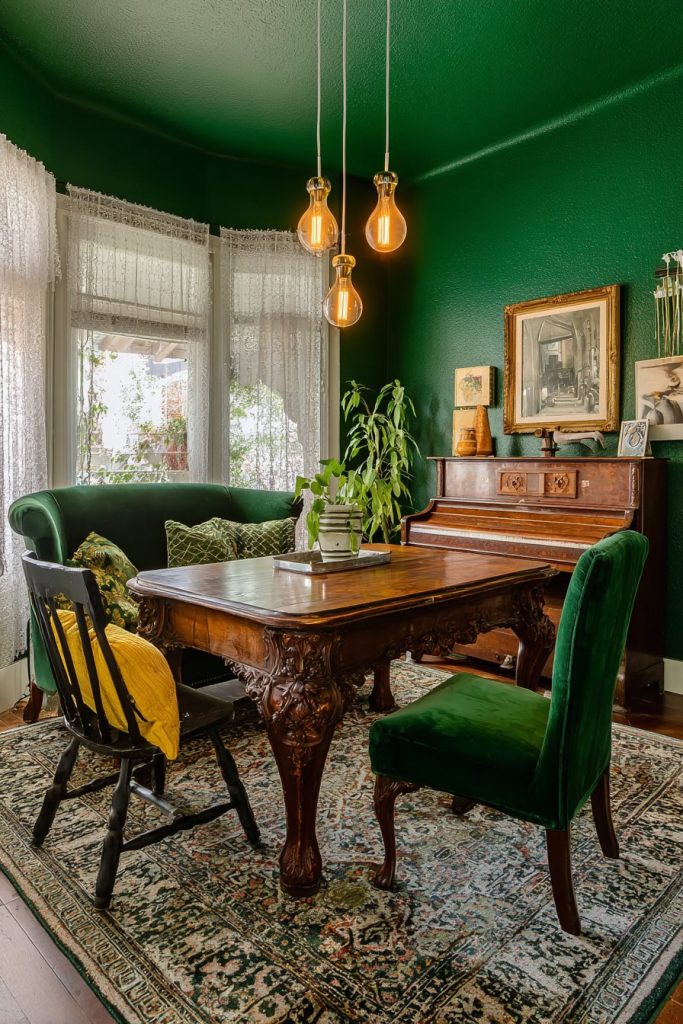 Deep forest green walls provide a sophisticated backdrop for the collected, personal aesthetic that defines eclectic decorating style. This rich color creates unity among diverse furniture pieces while providing enough drama to make statement pieces shine. Forest green’s natural associations also create a calming environment that makes eclectic collections feel curated rather than chaotic.