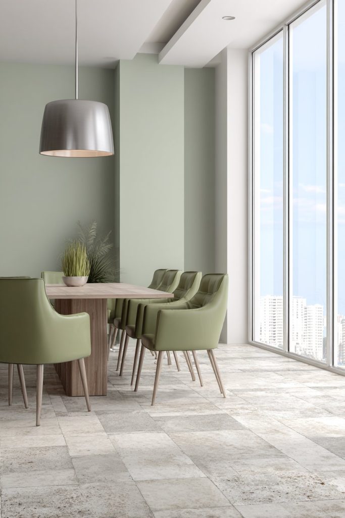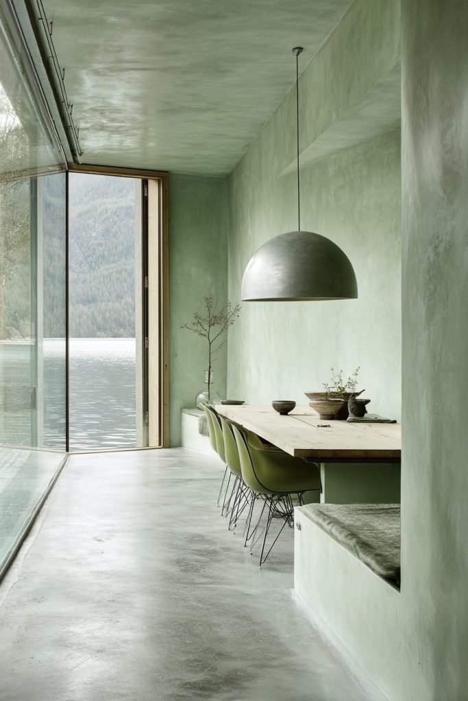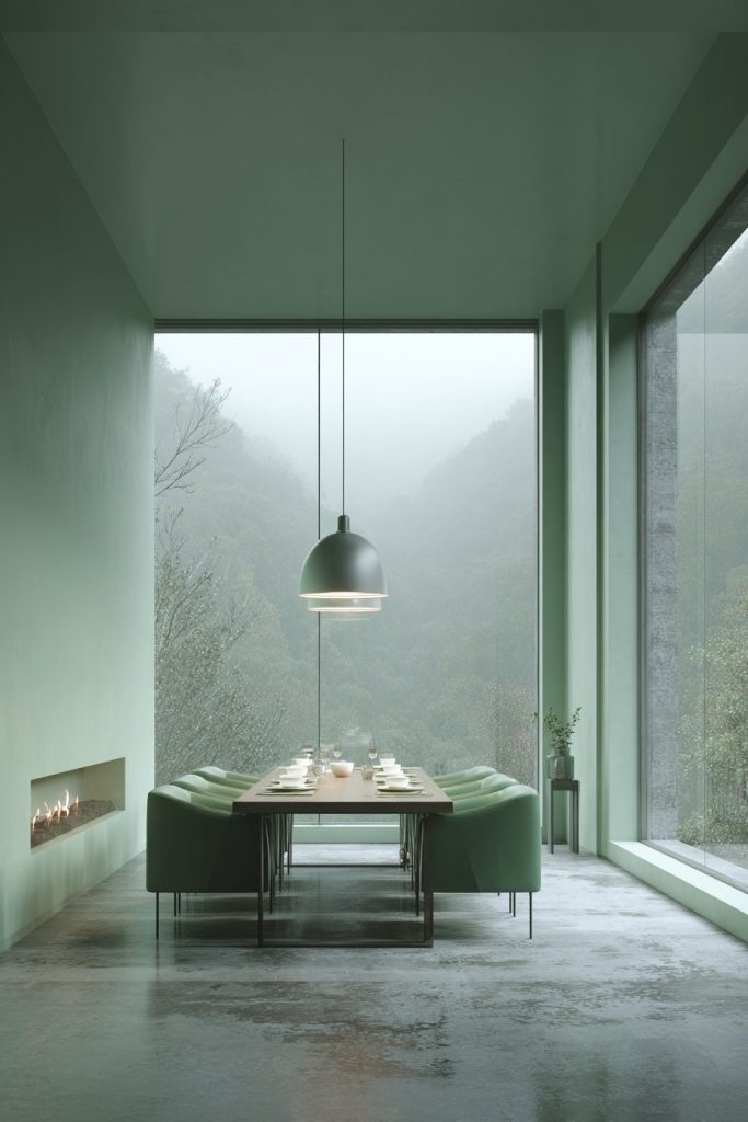 Pale mint green walls with concrete floors create the perfect foundation for minimalist design that emphasizes space, light, and essential elements. This color combination promotes tranquility while providing enough visual interest to prevent stark minimalism from feeling cold or institutional. Concrete floors add industrial authenticity while their smooth surface and neutral color allow furniture and wall color to dominate the visual composition.