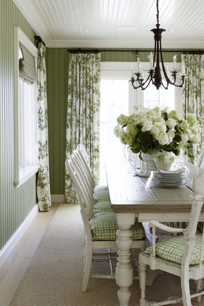 Warm olive green walls with white trim and beadboard details create the welcoming atmosphere that defines country style dining rooms. This earthy green tone evokes kitchen gardens and countryside landscapes while maintaining sophisticated color depth that prevents country style from appearing unsophisticated. White trim adds crisp definition while beadboard wainscoting provides architectural interest and traditional authenticity.