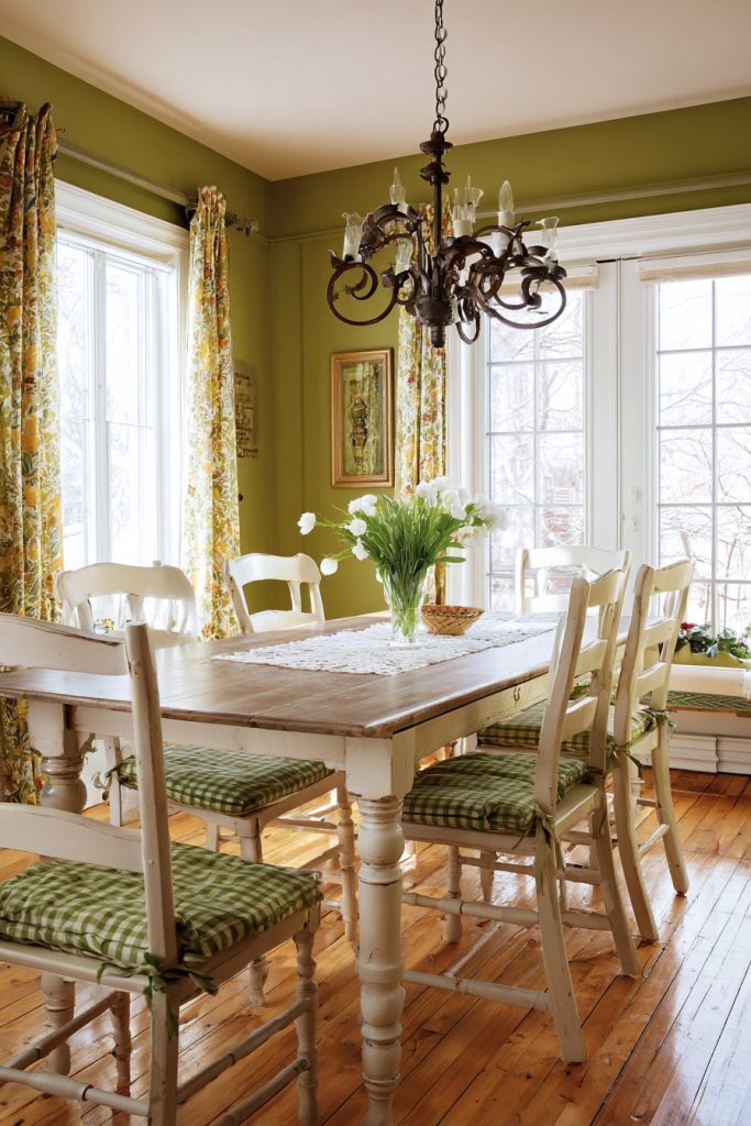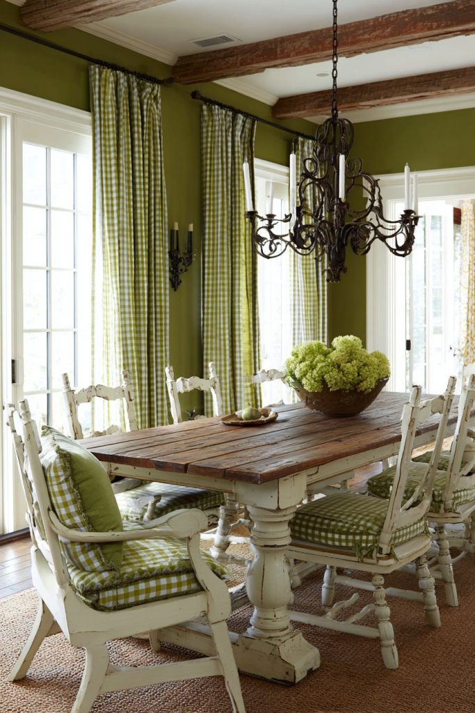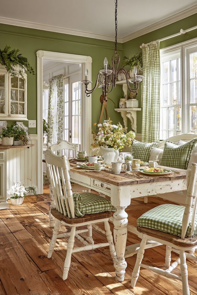 Ladderback chairs painted in distressed cream with green gingham cushions provide comfortable seating that perfectly captures country style’s emphasis on comfort and practicality. The distressed paint finish adds age and character while green gingham fabric introduces pattern and color that ties the seating to the wall color. Removable cushions provide seasonal flexibility and easy maintenance that makes country style practical for everyday living.