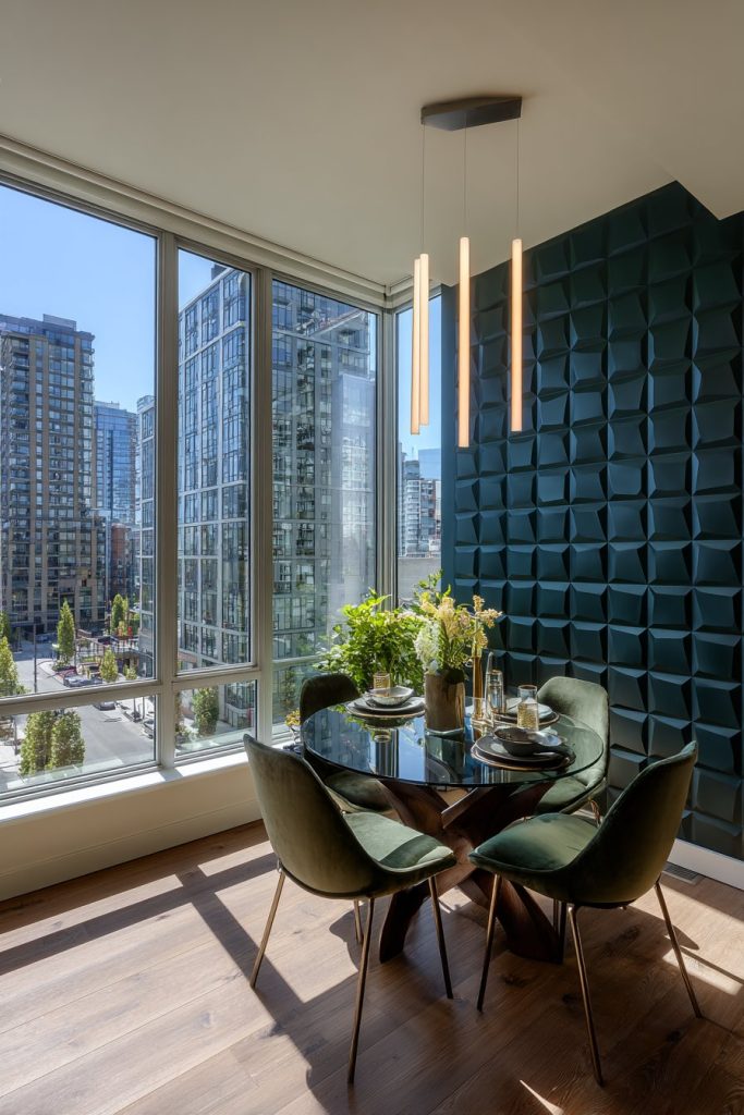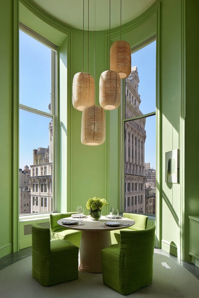Contemporary dining chairs upholstered in natural linen introduce a neutral element that allows both the emerald wall and walnut table to shine. Linen’s relaxed texture adds casual elegance that makes the space feel approachable despite its dramatic color choices. The natural fibers also contribute to the room’s organic feel, connecting the space to natural elements even in an urban setting.