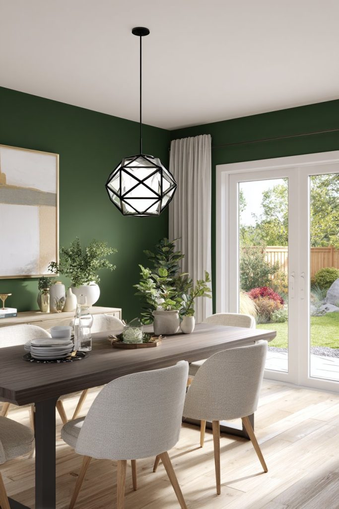 An emerald green accent wall serves as a bold focal point that can transform an ordinary dining room into an extraordinary space. This approach allows you to experiment with dramatic color while maintaining balance through neutral complementary walls in soft sage green. The contrast between the vibrant emerald and subtle sage creates visual depth that makes the room appear larger and more dynamic.