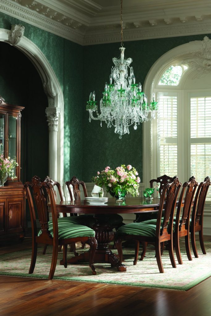 Formal mahogany dining furniture provides the gravitas and elegance that hunter green demands. The deep reddish-brown tones in mahogany create a rich color harmony with hunter green that feels both luxurious and grounded in tradition. Turned legs and carved details on mahogany pieces add architectural interest that complements the formality of wainscoting and crown molding.
