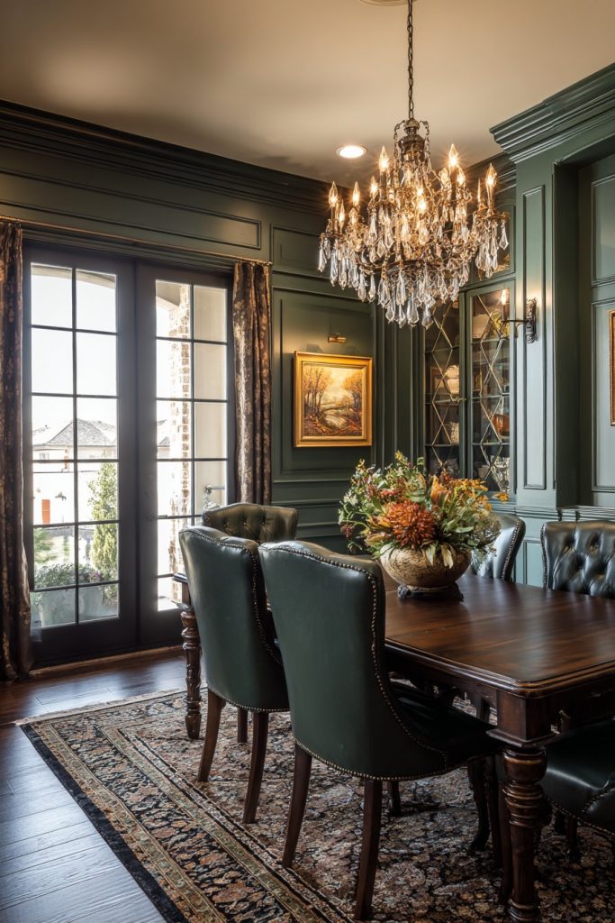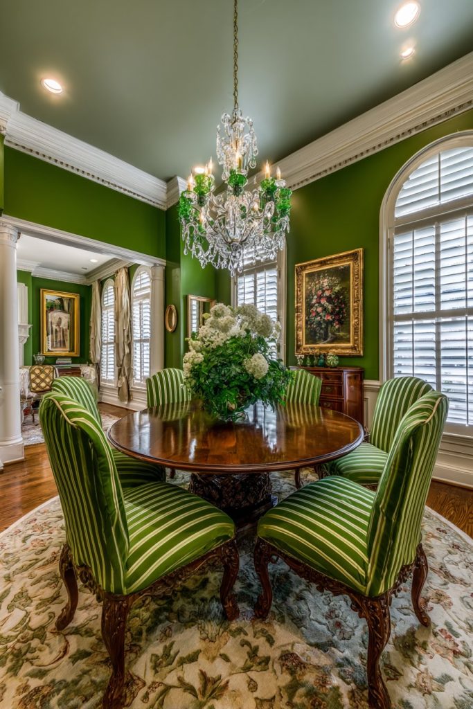 Traditional hunter green walls with white crown molding and chair rail details represent the pinnacle of classic American dining room design. This sophisticated color combination has been used in fine homes for centuries because it creates elegance without overwhelming furniture or artwork while providing a rich backdrop that enhances both formal entertaining and family dining. The architectural details add definition and visual interest that elevate the space beyond simple painted walls.