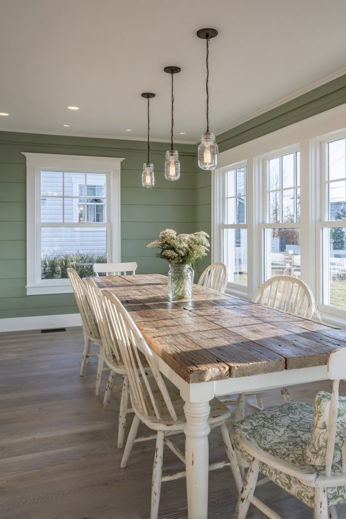 Muted olive green on shiplap walls creates the perfect foundation for authentic farmhouse style that feels both nostalgic and fresh. This earthy green tone evokes the rolling countryside and connects the dining space to agricultural traditions while maintaining modern livability. The horizontal lines of shiplap add architectural interest and movement that prevents solid color walls from appearing flat or monotonous.