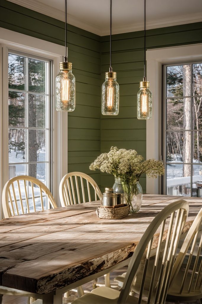 Brass fixtures provide the perfect metallic accent for this color palette, offering warmth that complements both the green walls and natural wood elements. A brass chandelier with Edison bulbs creates ambient lighting that enhances the room’s cozy yet elegant atmosphere. The warm glow of Edison bulbs adds vintage charm while providing the perfect light temperature to make green walls appear rich and inviting rather than cold or institutional.