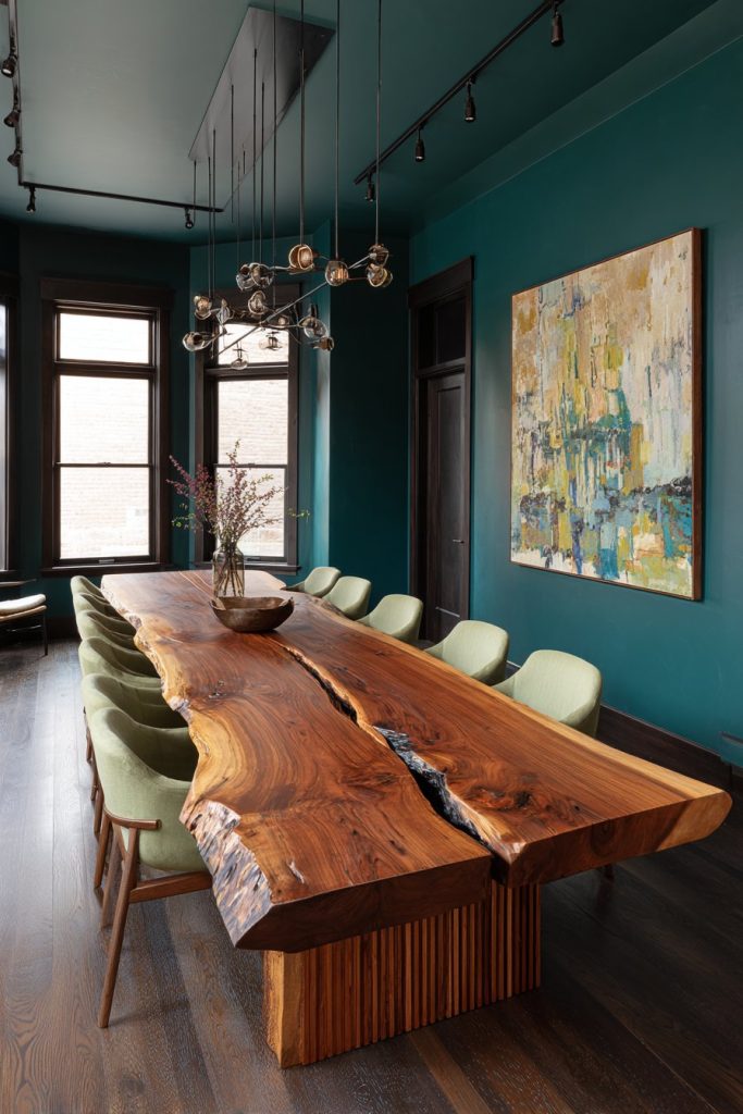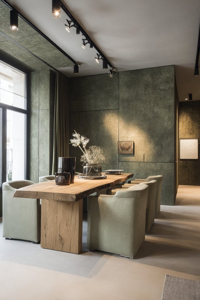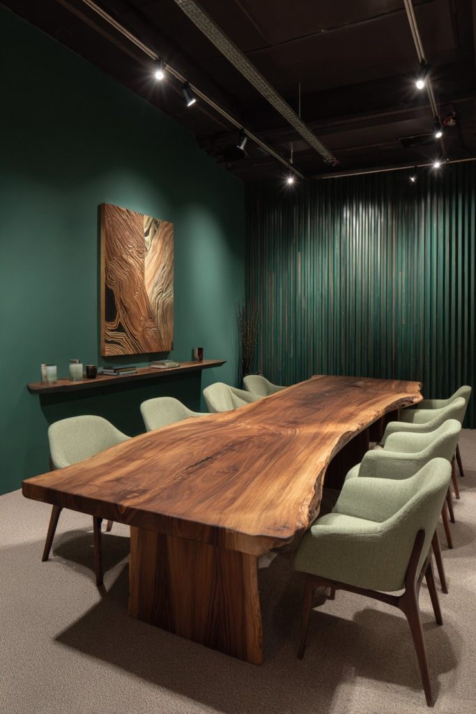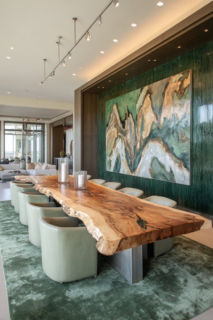 Live-edge walnut dining tables bring organic contrast to the geometric precision of vertical paneling. The natural, irregular edge of live-edge wood softens the contemporary aesthetic while maintaining the sophisticated material palette. Walnut’s rich grain patterns and warm chocolate tones create beautiful color harmony with dark green while adding natural texture that prevents the space from feeling too sleek or cold.