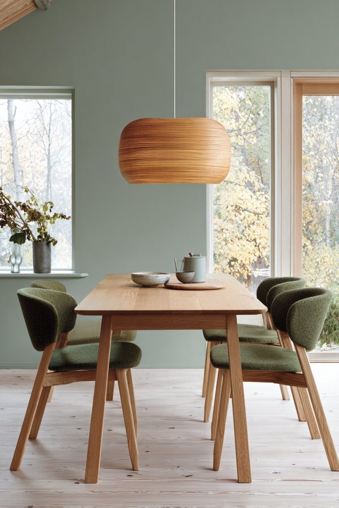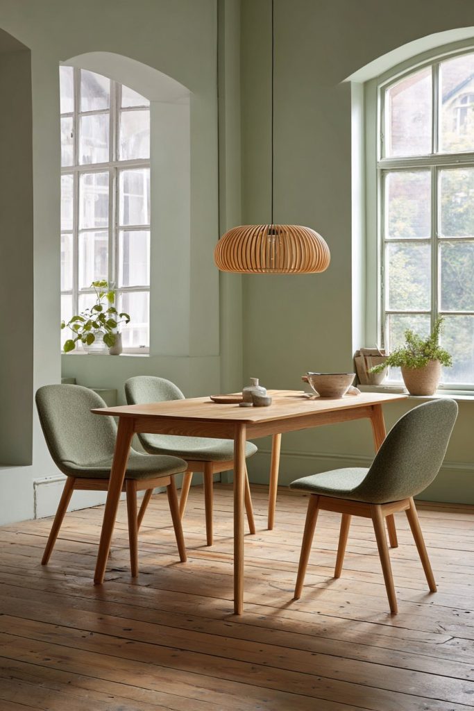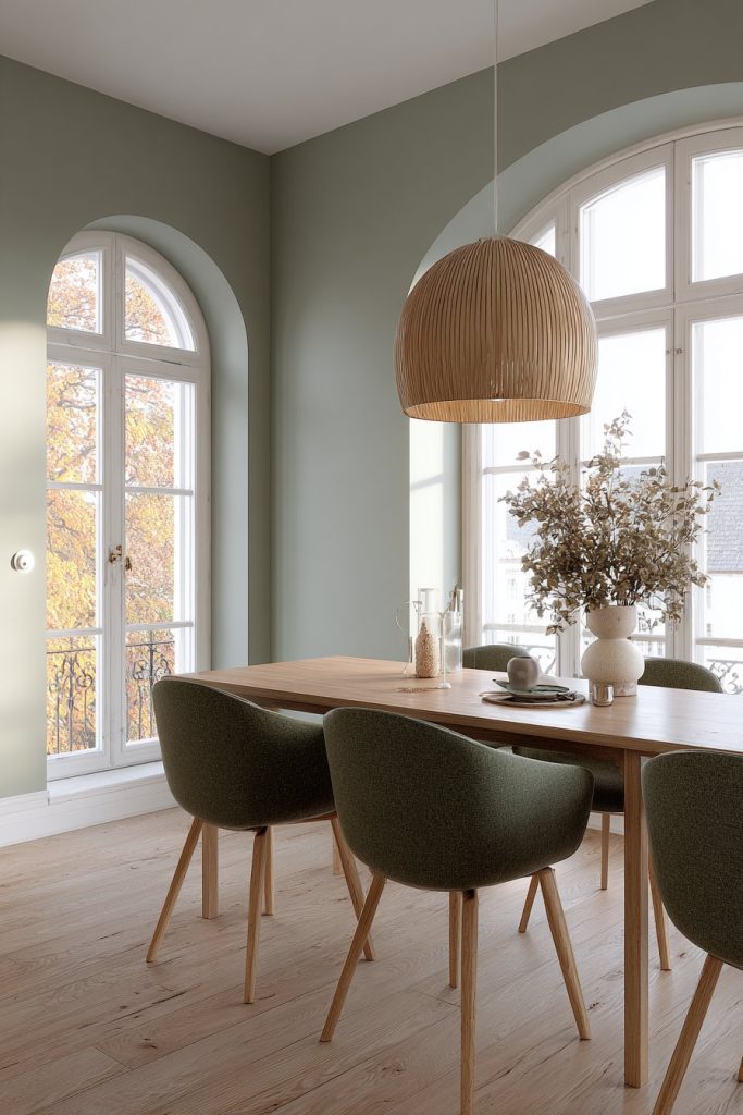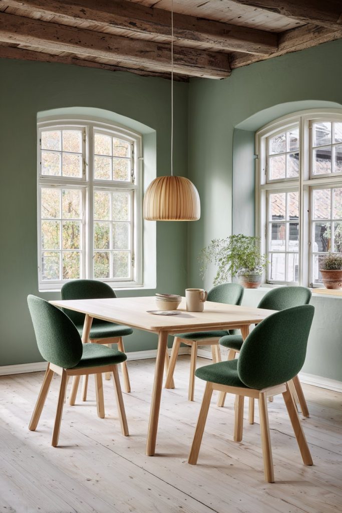 Forest green wool upholstery on dining chairs provides comfort and durability while introducing a deeper green tone that adds visual weight and sophistication. Wool’s natural texture and temperature regulation make it ideal for dining chair upholstery, while the darker green creates subtle contrast that defines seating areas without disrupting the room’s serene atmosphere.