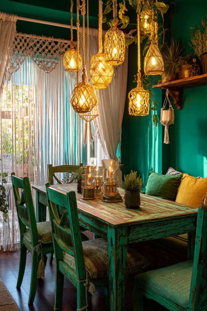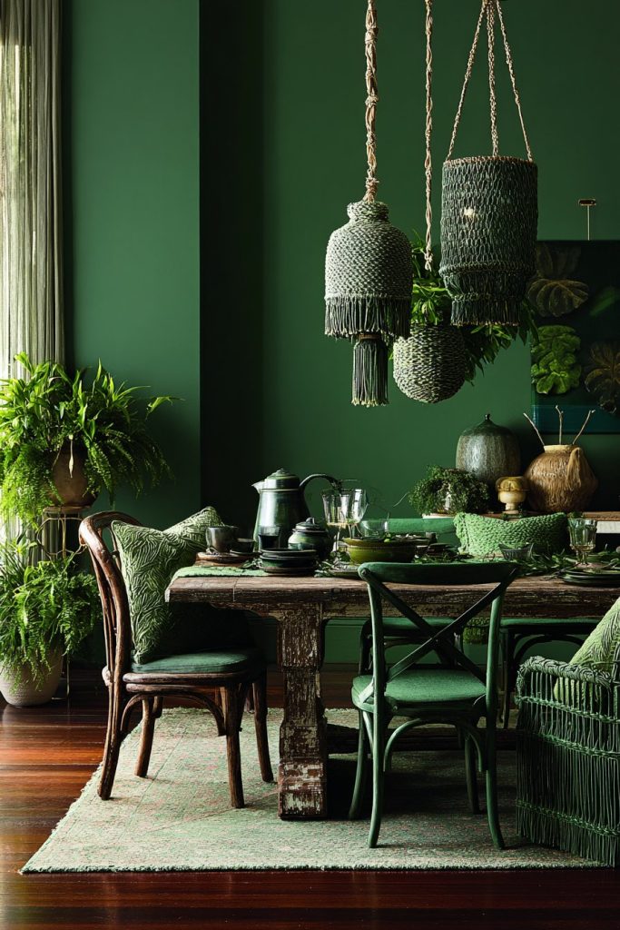 Deep jade green walls provide a rich backdrop for the collected, eclectic aesthetic that defines bohemian style. This saturated green tone creates drama and sophistication while serving as a unifying element that ties together diverse furniture pieces and decorative objects. Jade green’s slight blue undertones add depth and complexity that prevents the color from appearing flat or one-dimensional.