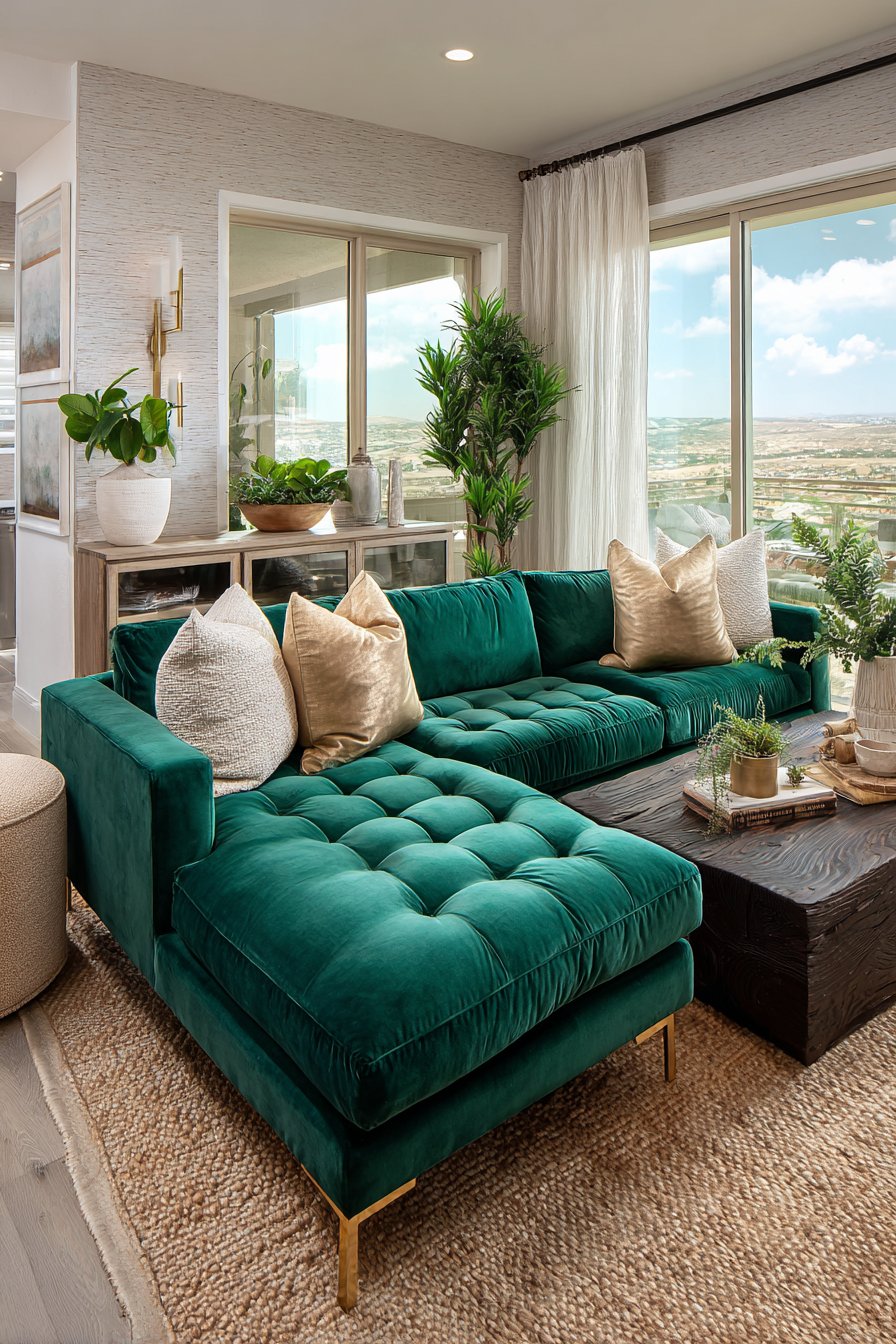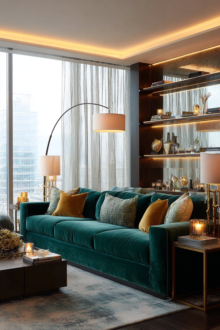 A marble coffee table with brass inlay demonstrates the commitment to premium materials characteristic of luxury interiors. The marble’s natural veining creates organic pattern and variation, while the brass inlay adds geometric precision and metallic shimmer. Silk velvet pillows in champagne and navy enhance the emerald sofa’s opulent character while introducing complementary colors that read as sophisticated rather than matchy or coordinated.