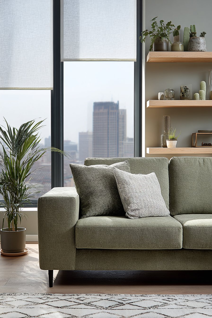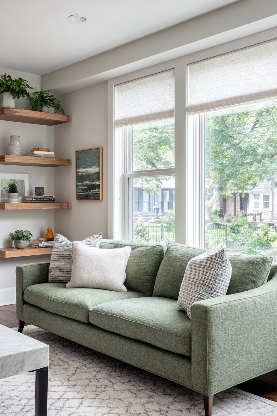 The geometric wool rug in cream and grey tones serves multiple purposes in this design. It anchors the seating area, defines the living space boundaries, and introduces subtle pattern without competing with the sofa’s gentle green hue. Large windows dressed with simple white roller shades allow abundant natural light to flood the room, highlighting the beautiful texture of the linen upholstery and creating gentle shadows that add depth throughout the day. The quality of light in this space transforms constantly, making the sage green appear slightly different from morning to evening—sometimes more grey, sometimes more vibrant.