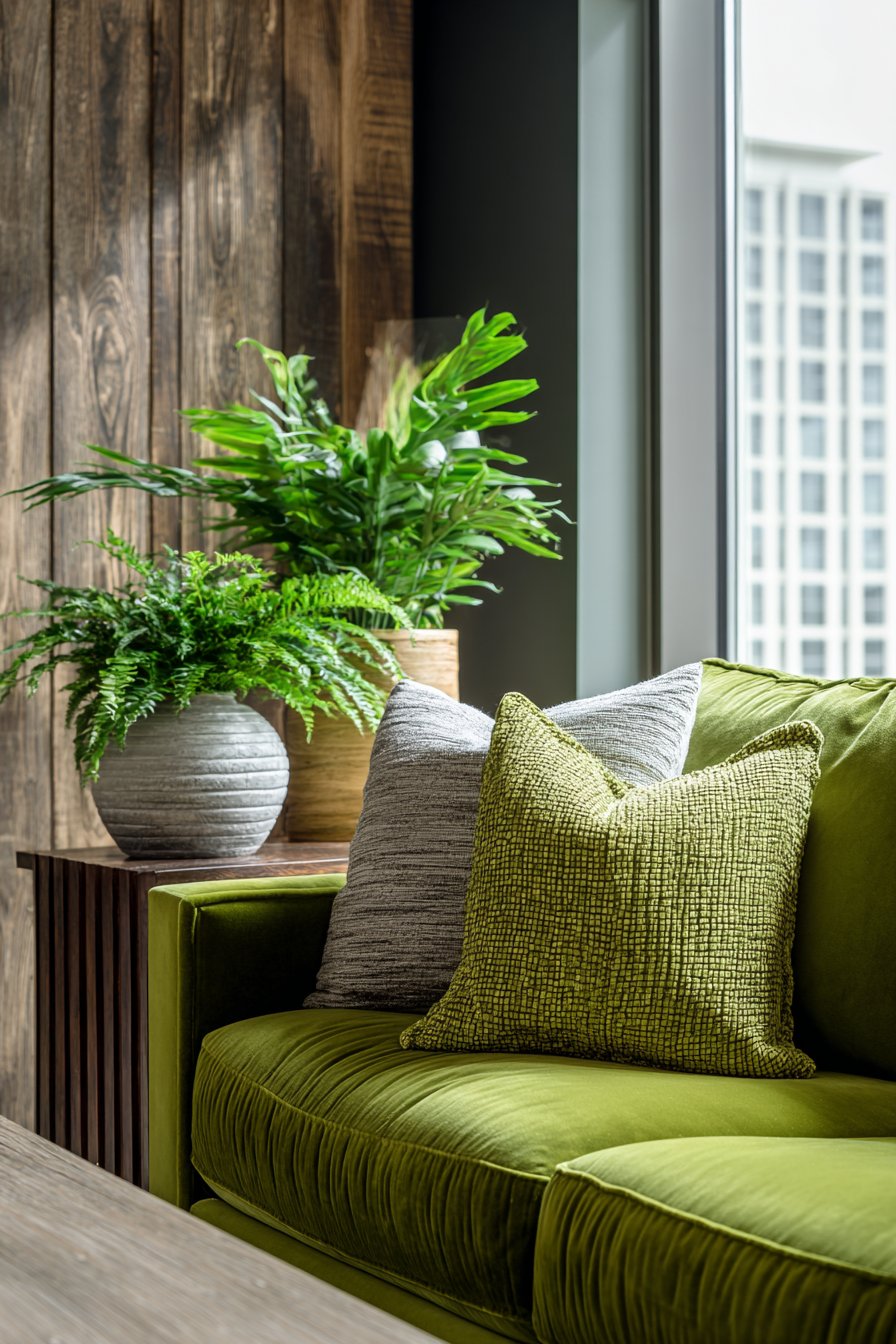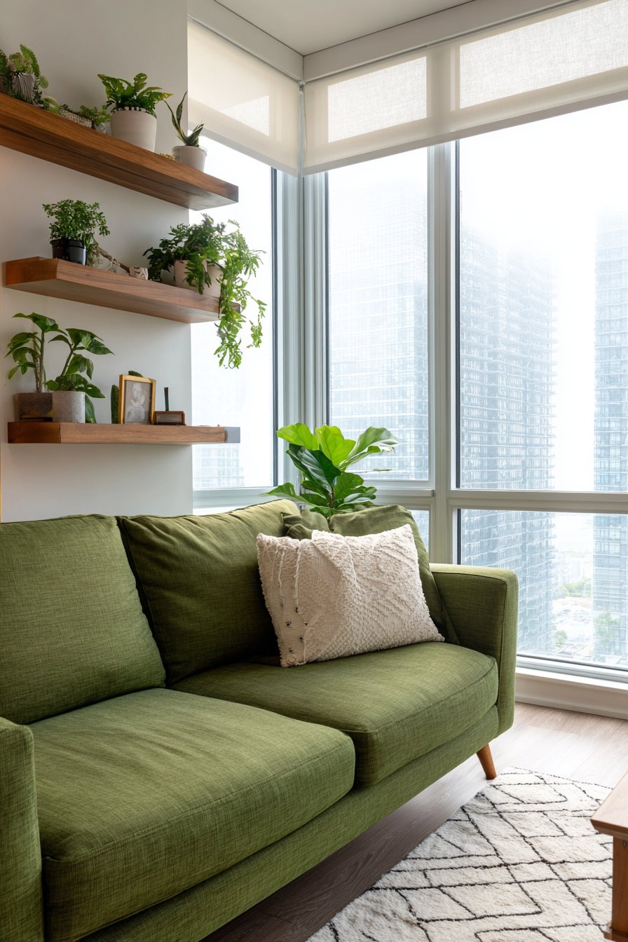 Key Design Tips: Choose plants suited to your space’s light conditions and your maintenance abilities—success requires matching plants to environment. Incorporate plants at multiple heights from floor to ceiling, creating layers of green. Use natural, sustainable materials throughout—wood, cotton, linen, rattan, jute. Ensure adequate natural light for plant health through windows, skylights, or supplemental grow lights. Consider living walls or vertical gardens to maximize greenery in limited space. Choose an earthy green sofa tone that complements rather than competes with plant foliage. Maintain good air circulation to prevent moisture problems from plant transpiration.