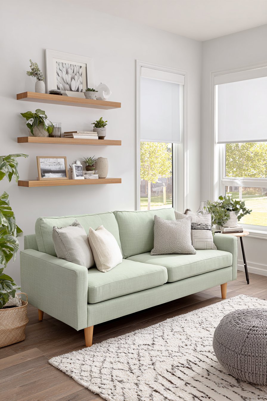 A modern living room featuring a sage green linen sofa represents the perfect marriage of contemporary aesthetics and natural tranquility. The clean lines and tapered wooden legs of the sofa create a sense of airiness, while the soft sage hue provides just enough color to prevent the space from feeling stark or clinical. Natural oak floating shelves mounted on crisp white walls display carefully curated decor items—perhaps a few pottery pieces, small succulents in minimal planters, and a couple of thoughtfully chosen books. This intentional curation prevents visual clutter while adding personality to the space.