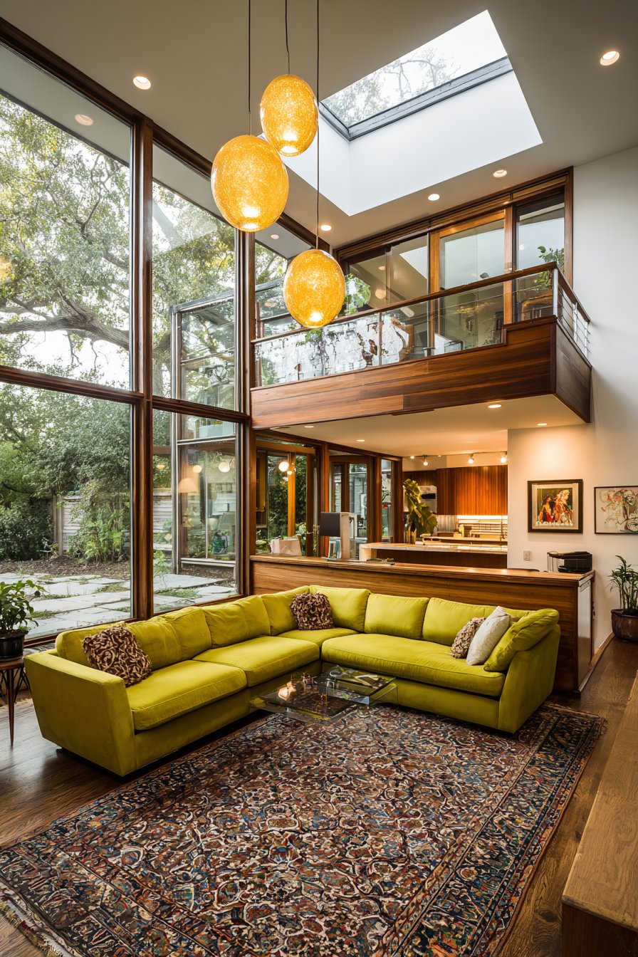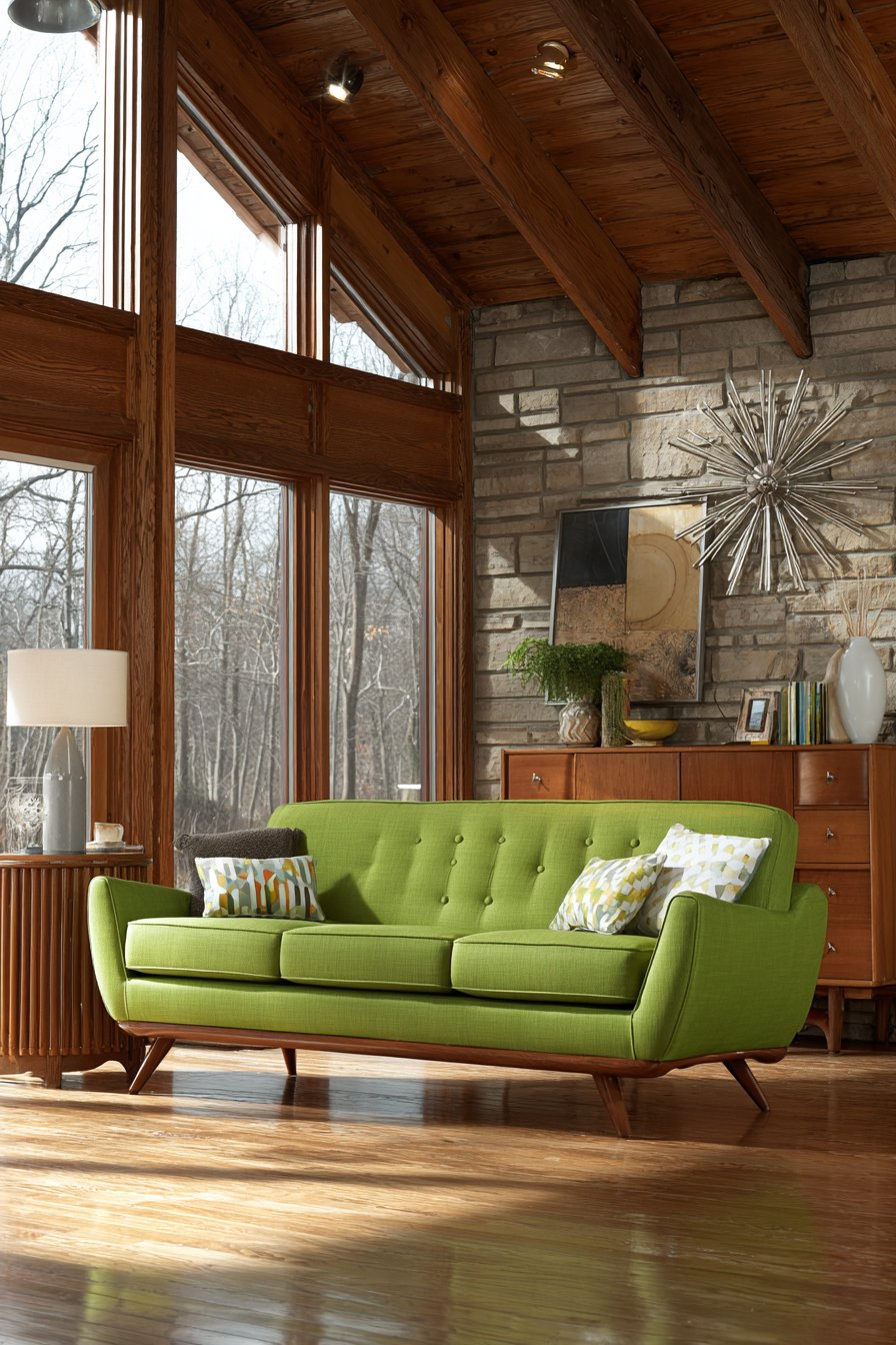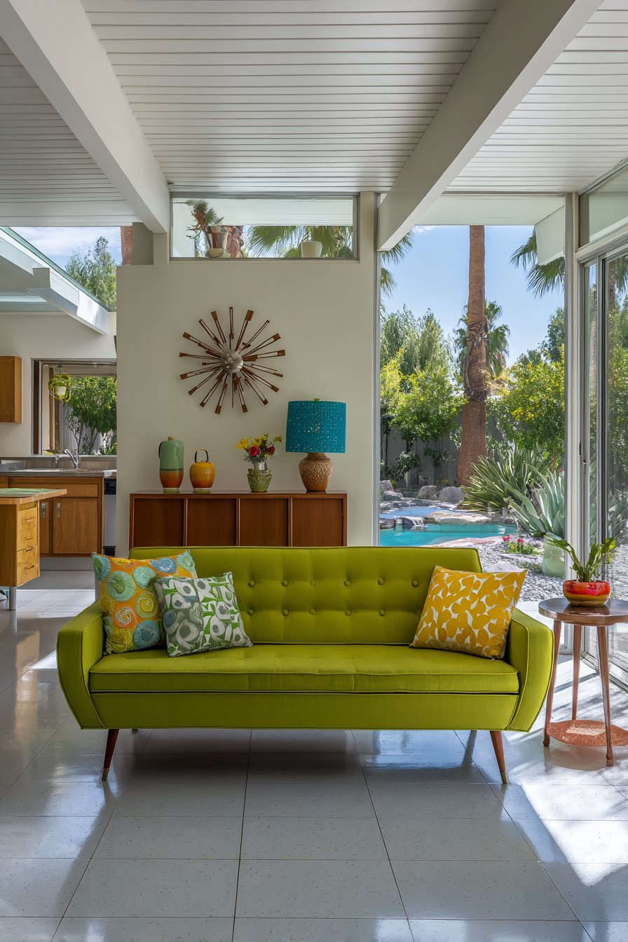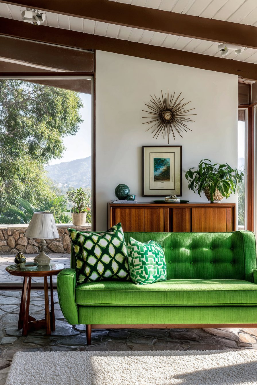 A starburst clock mounted on the wall and geometric throw pillows on the kelly green sofa reinforce the retro aesthetic through period-appropriate decorative elements. Large picture windows with minimal treatment flood the space with natural light, reflecting the mid-century love of indoor-outdoor connection and transparency. The lack of heavy drapery or fussy window treatments maintains clean lines while showcasing the sofa’s vibrant color against abundant daylight. This is a space that honors design history while remaining thoroughly livable in contemporary life.