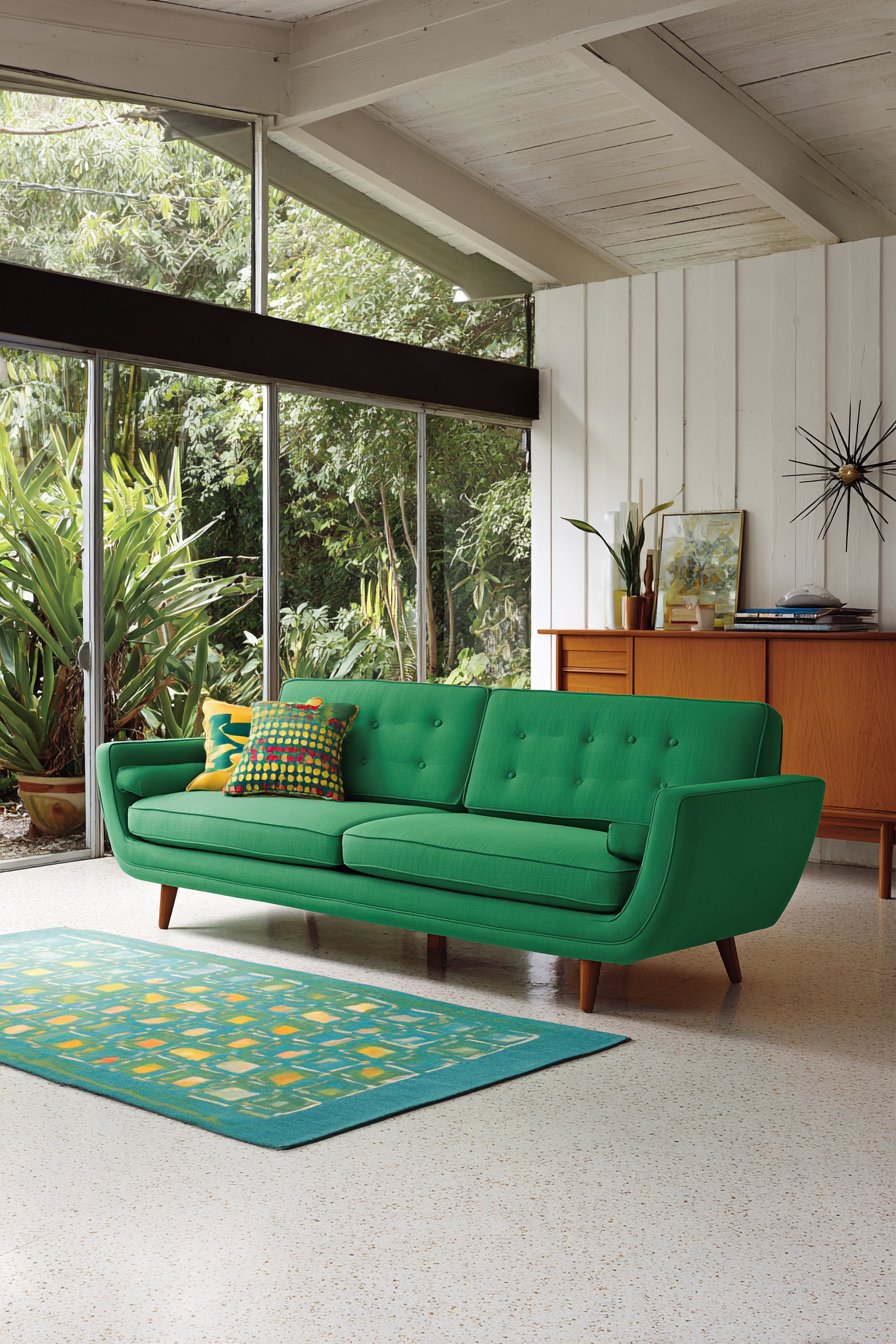 Mid-century modern design from the 1950s and 60s continues to captivate with its clean lines, organic forms, and optimistic color palette. A vintage-inspired kelly green sofa with tapered splayed legs and button-back cushions channels this iconic era, its vibrant green hue recalling the bold color choices popular in post-war design. The button-back construction and neat proportions demonstrate the mid-century commitment to both comfort and visual elegance, proving that functional furniture can also be beautiful.