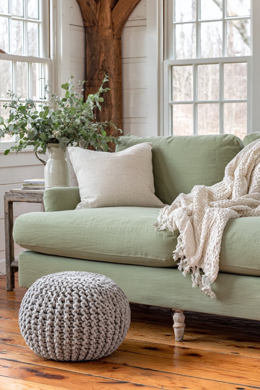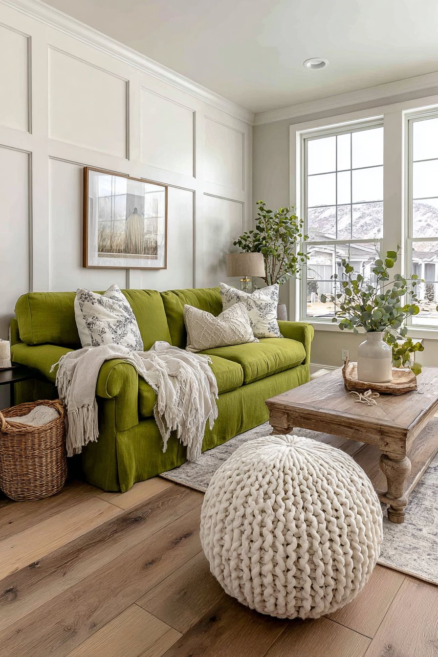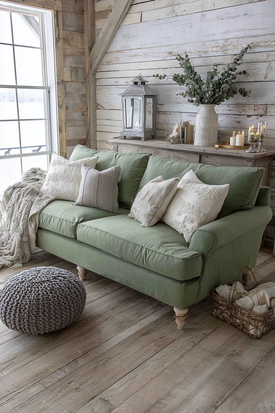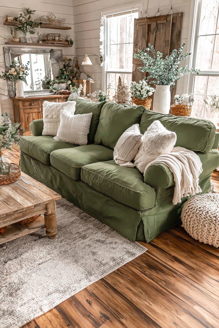Cotton throw blankets in natural colors drape casually over the sage green sofa, ready for curling up on chilly evenings. Fresh eucalyptus arranged in simple ceramic vases brings the garden indoors while providing subtle fragrance and organic movement. Wide-plank wood flooring in honey tones adds warmth underfoot while its substantial proportions suggest reclaimed barn wood or vintage flooring. A chunky knit pouf provides flexible seating or footrest function while its oversized scale and handmade quality reinforce the farmhouse commitment to craftsmanship and comfort.